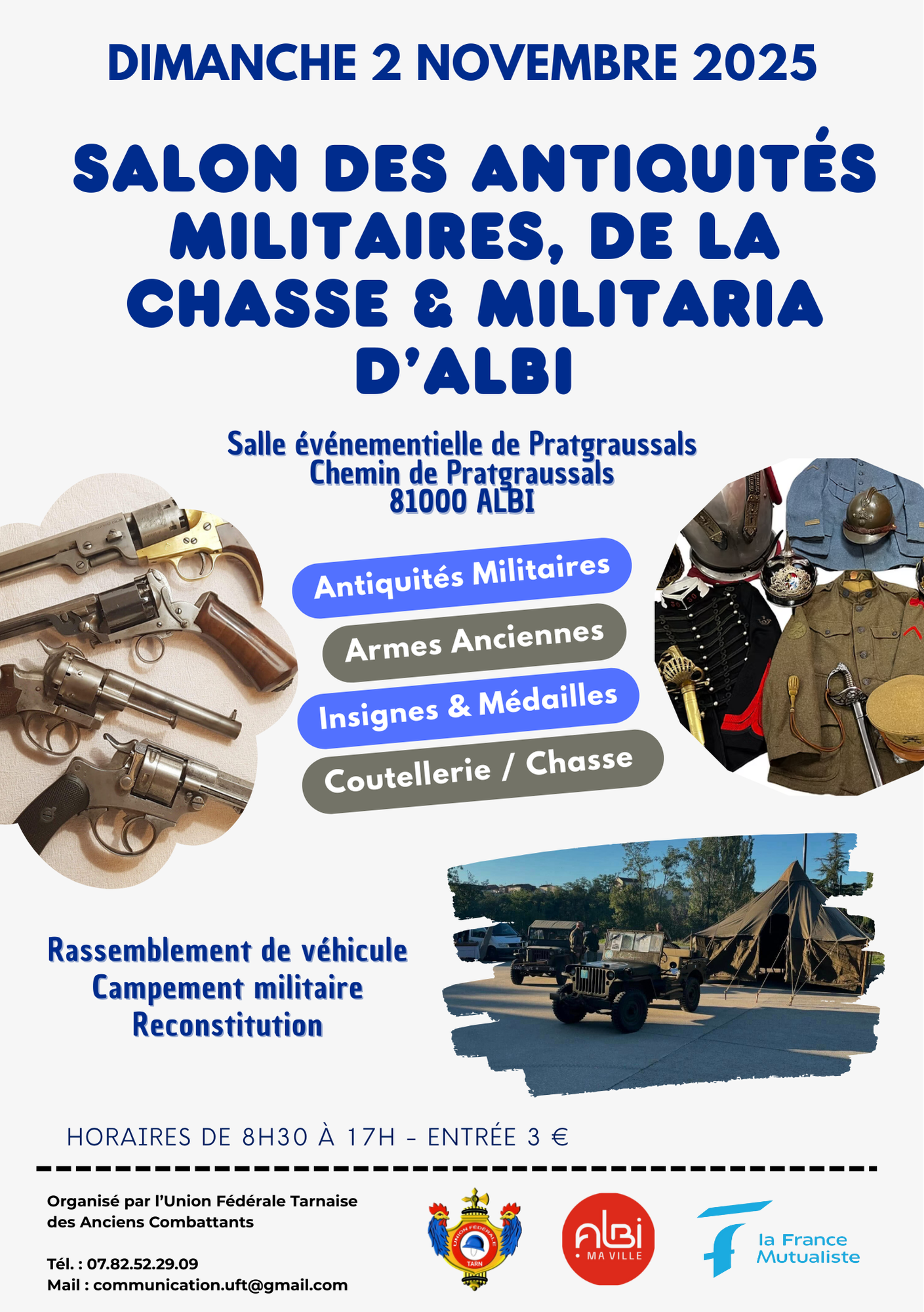 L’Union Fédérale Tarnaise des Anciens Combattants à le plaisir de vous annoncer son deuxième Salon des antiquités militaires, de la chasse & militaria d’Albi.