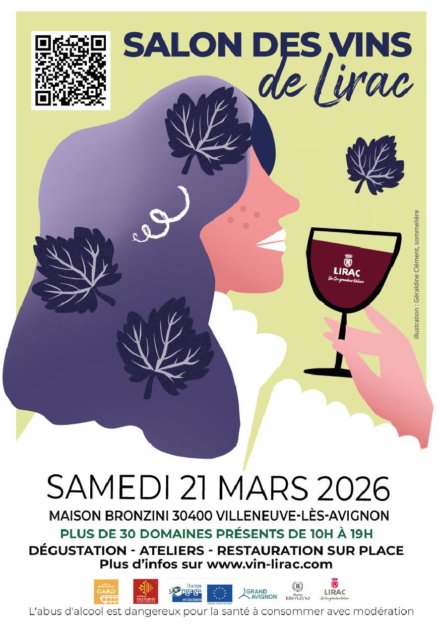Le Salon des Vins de Lirac revient le samedi 21 mars 2026, de 10h à 19h, à la Maison Bronzini à Villeneuve lez Avignon. Plus de 30 domaines, dégustations, ateliers œnologiques et restauration dans une ambiance conviviale.