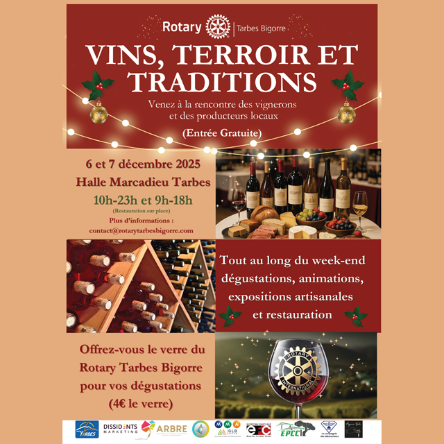 Le Rotary Tarbes Bigorre est heureux de vous accueillir au salon « Vins, Terroirs et Traditions » et vous invite à profiter pleinement de nombreux stands de dégustation et d’achat de vins, de produits de nos régions et autres, d’animations récréatives et musicales !