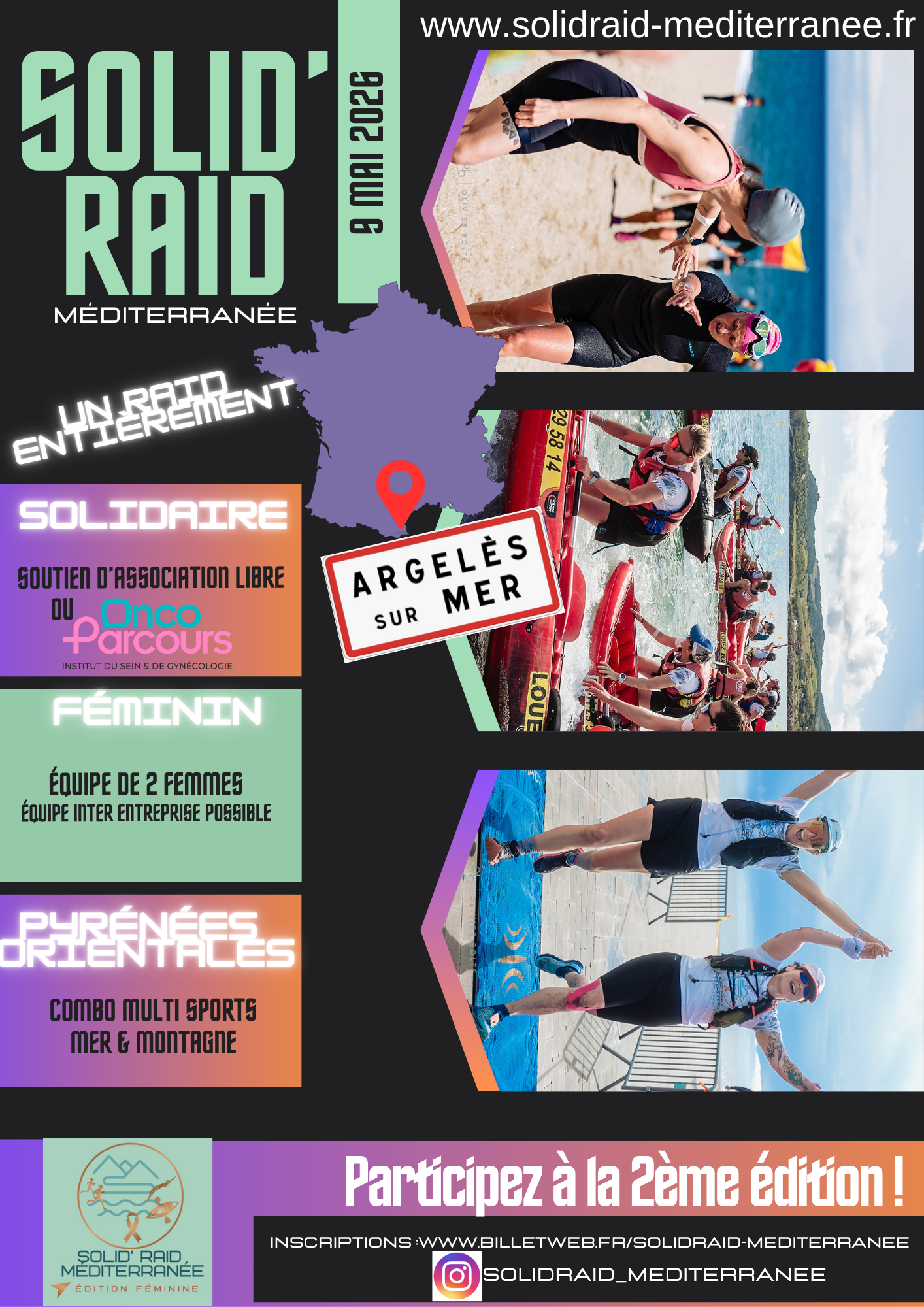 Ici, pas besoin d’être pro pour s’élancer : juste de la détermination, de la complicité, et l’envie de se dépasser ensemble. Le Solid’Raid, c’est une aventure sportive et solidaire dans un décor de rêve, entre mer Méditerranée et contreforts des Pyrénées. Un défi accessible, rythmé par des épreuves variées, encadré et sécurisées, où chaque participante devient actrice d’un moment de partage et de sororité. L’objectif : vivre une expérience intense, entre sport outdoor, entraide et soutien à une cause forte — ici, l’association Onco Parcours.