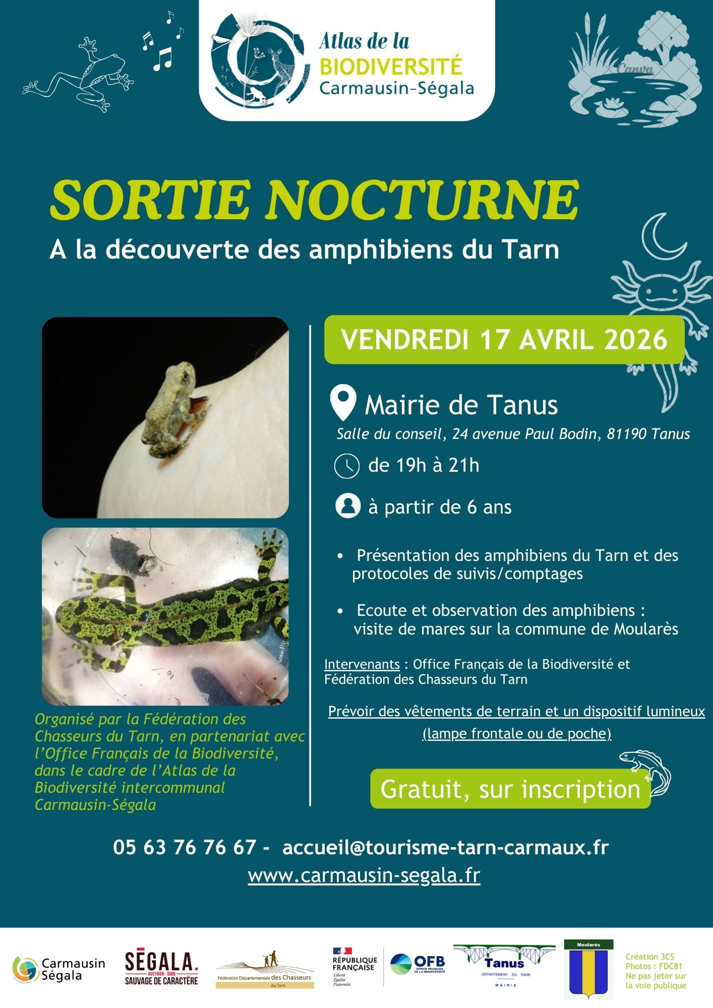 La Communauté de Communes dans le cadre de l’atlas de la biodiversité intercommunale invite les habitants à découvrir les amphibiens avec un temps à la mairie de Tanus pour une présentation des espèces et des protocoles de comptages. Le second temps amènera les inscrits sur la commune de Moularès pour écouter et observer les amphibiens en bord de mares. Prévoir vêtements, chaussures de terrain et lampe frontale ou de poche. Attention groupe limité à 10 personnes (enfants accompagnés de plus de 6 ans) – prévenir en cas d’annulation.