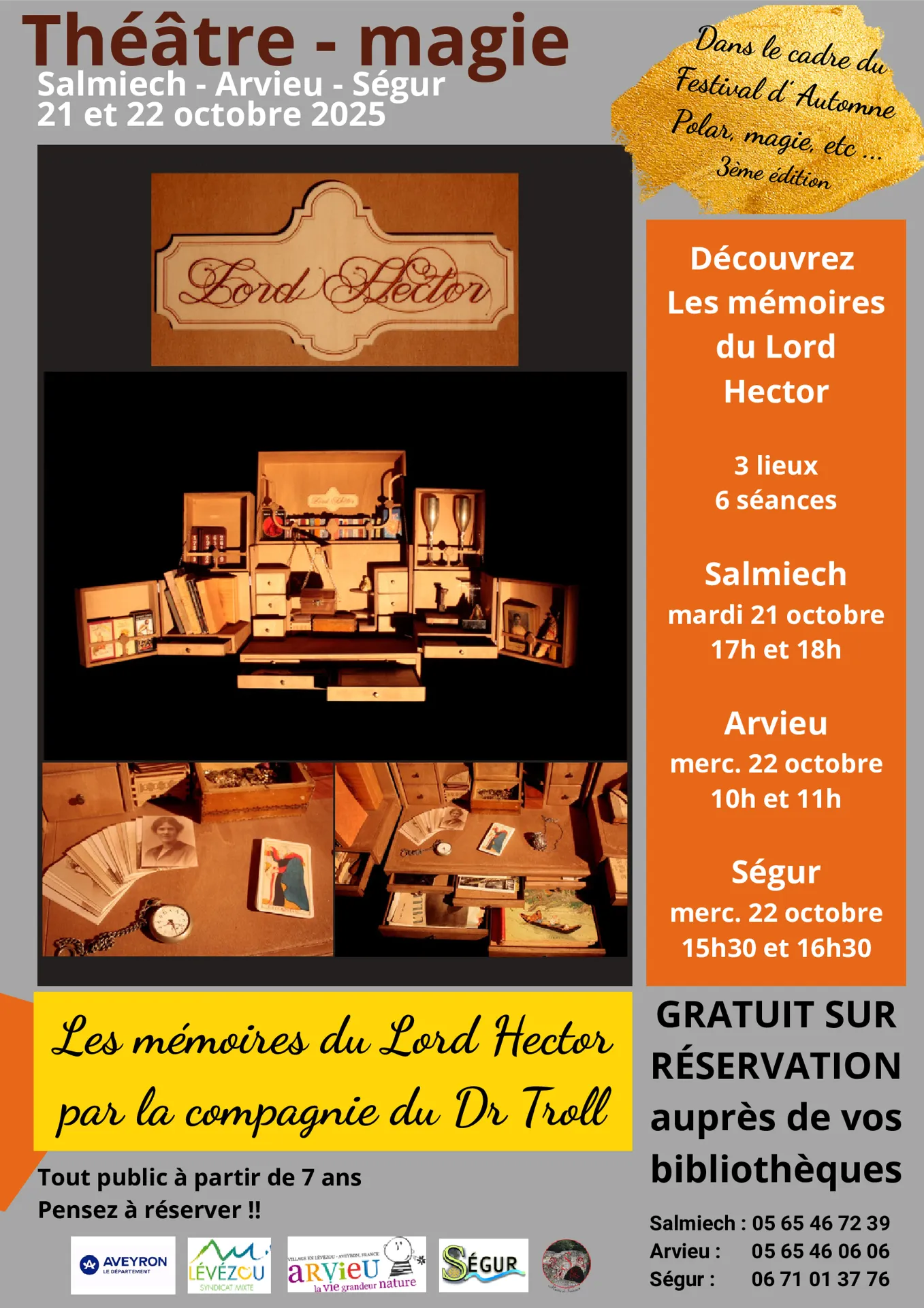 Retrouvez Dr Troll en spectacle avec « Les Mémoires du Lord Hector » à Arvieu et Ségur. Cette animation est proposée dans le cadre du Festival d’automne, Polar, magie, etc qui se déroule du 17 octobre au 16 novembre 2025. Consultez le programme complet du festival sur https://bit.ly/3IoXXoq.