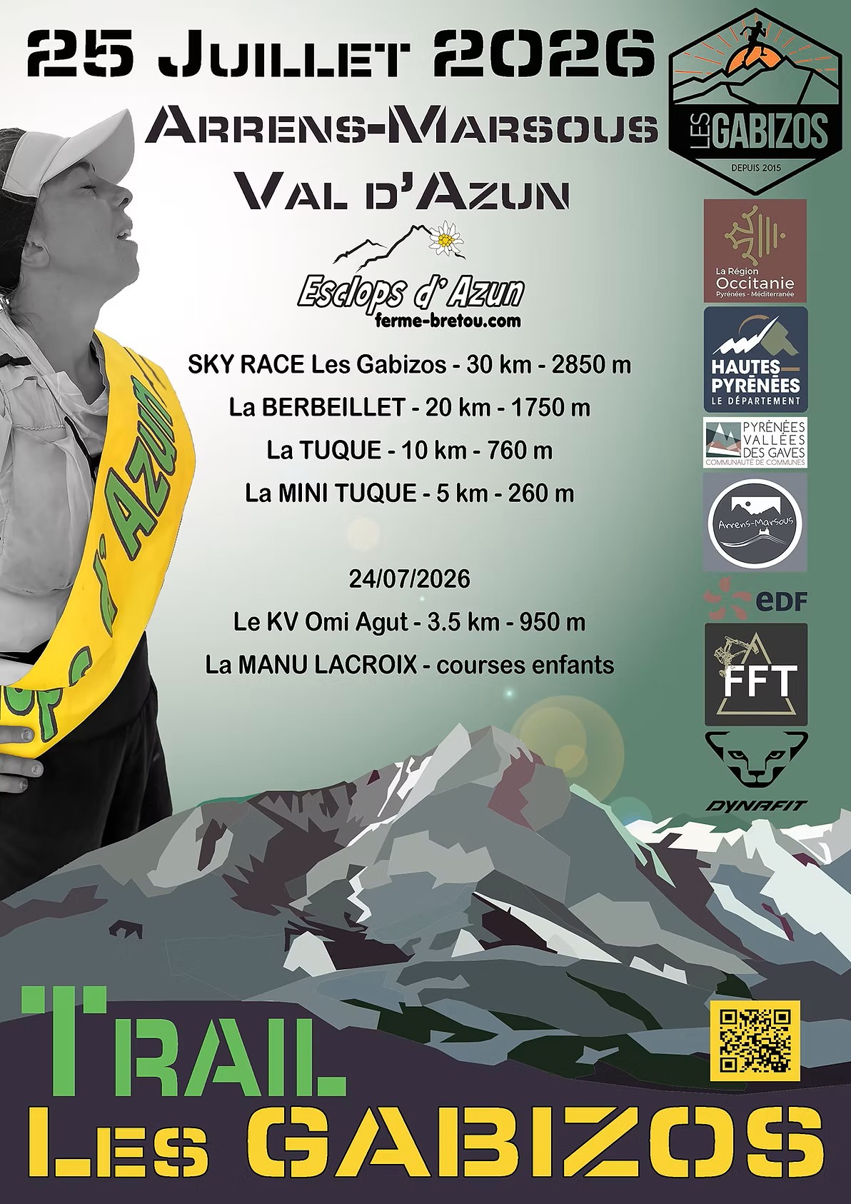 Programme : Les parcours : – GABIZOS SKY RACE (30kms – 2750m d+) – BERBEILLET (20kms – 1750m d+) – TUQUE D’ARRENS (10km – 750m d+) – MINI TUQUE (5km – 260m d+) – MANU LACROIX (course pour enfants)
