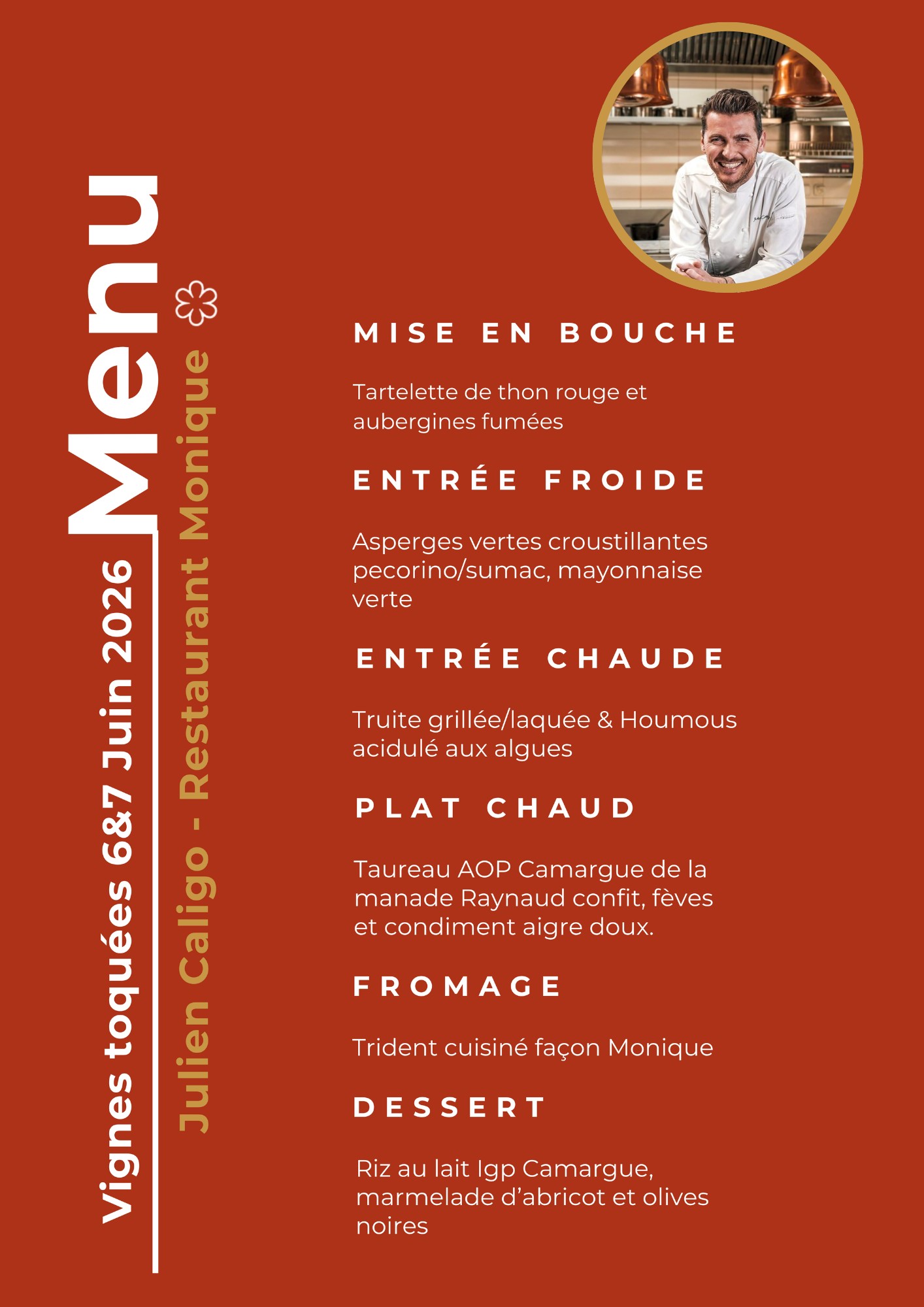 2026 sera sublimé par le talent du chef Julien Caligo, originaire du Gard. Passé par de prestigieuses maisons (Michel Rostang, La Villa Madie, Le Castellas), il a décroché deux étoiles Michelin au Duende à Nîmes et la cuisine de Pierre Gagnaire avant d’ouvrir Monique, son restaurant à Calvisson auréolé juste un an après son démarrage d’une étoile.