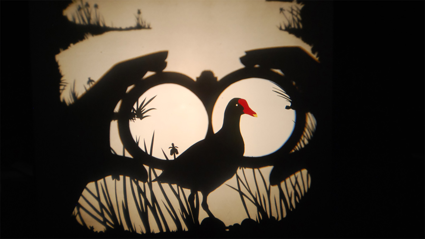 L’oiseau est partout, en ville comme à la campagne, en bord de mer comme en haut des montagnes. C’est la petite mésange et le long héron, la ronde poule d’eau et le majestueux gypaète. Avec cet outil magique qu’est le rétroprojecteur, Coline Hateau sublime des nervures ou des mandibules en ciselant avec son scalpel des paysages graphiques qui se noient sous des liquides aux réactions chimériques. Comme dans une danse, les mots mis en chanson par Arnaud Millan, lui aussi présent sur scène, viennent compléter l’image faite d’ombres chaudes et de mouvements au rythme des mains qui manipulent.