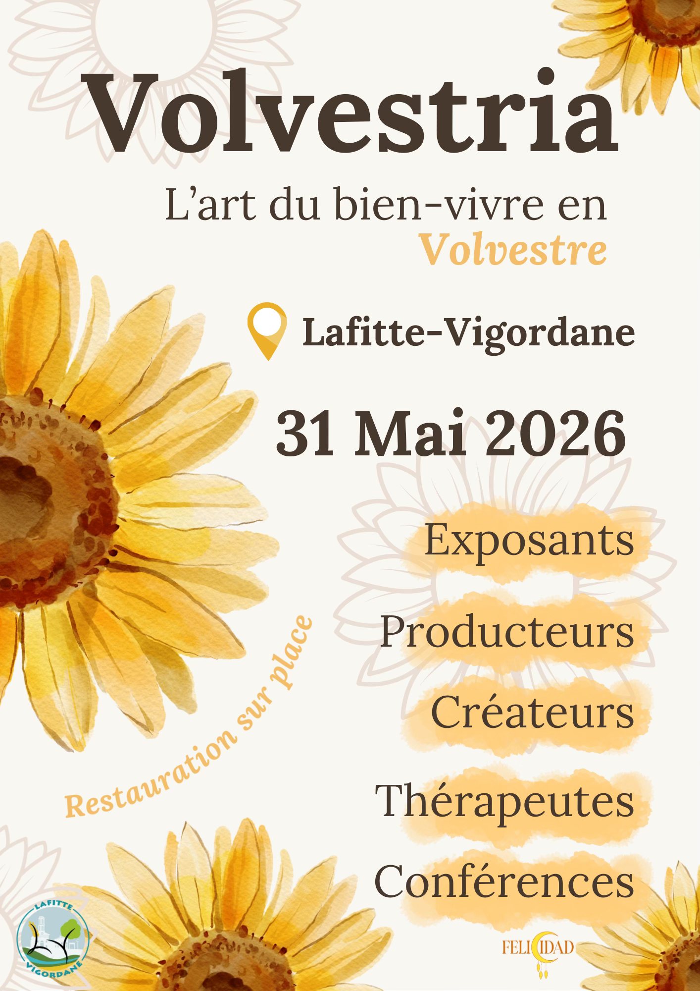 Programme : Rendez-vous le dimanche 31 mai dans les jardins de la médiathèque de Lafitte-Vigordane. Volvestria est une journée dédiée au bien-vivre, aux rencontres, à la créativité et à tout ce qui fait vibrer notre territoire. Une parenthèse lumineuse, en plein air, où l’on pourra flâner, découvrir, goûter, échanger… et profiter simplement d’être ensemble. Au programme : – Producteurs du territoire – Créateurs & artisanat local – Exposants bien-être – Thérapeutes – Conférences & découvertes – Restauration sur place Volvestria, c’est l’envie de faire vivre notre belle région autrement, de créer du lien et de mettre en lumière celles et ceux qui la font vibrer. Pour exposer : Mail : felicidad.asso@gmail.com Les candidatures permettent de composer une journée harmonieuse et d’éviter les doublons entre stands. Tarif exposant : 40 € – stand de 3 m Candidatures ouvertes dès aujourd’hui !
