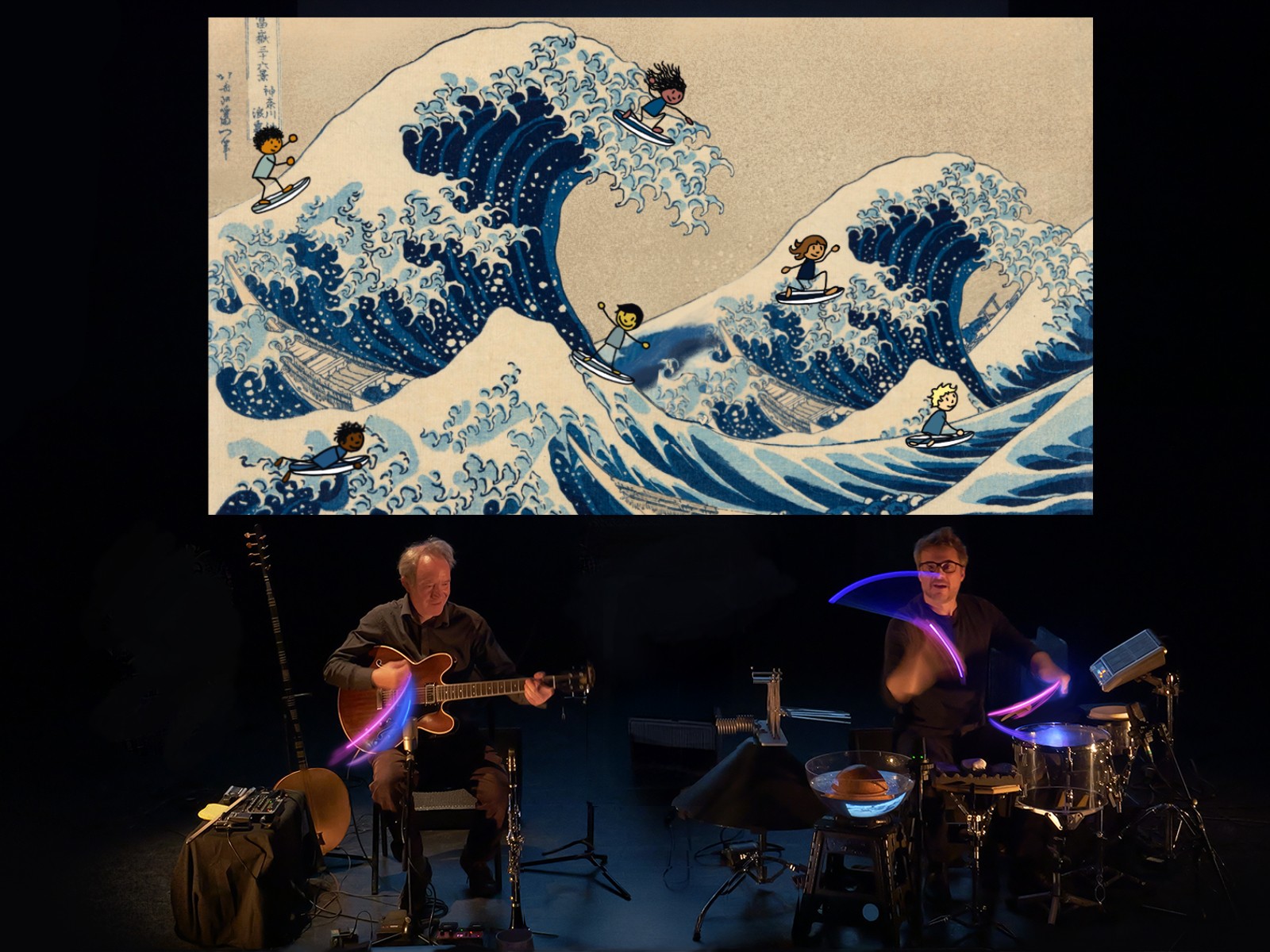 Les musiciens, de part et d’autre de l’écran central manipulent quelques objets colorés, mais surtout avec leur instrumentarium incroyable – mêlant instruments à cordes et eau, cailloux, tiges de verres ou feuilles de papier – nous emmènent dans un monde sonore inouïe et virtuose.