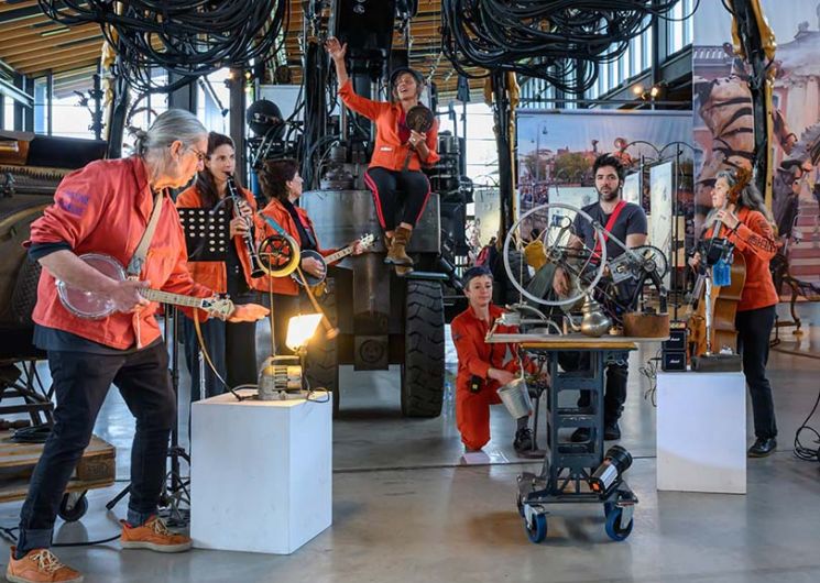 Musiciens de la Halle de La Machine se réunissent autour de Mino Malan, compositeur et chef d’orchestre de la Cie La Machine, afin de faire vibrer le bestiaire mécanique.