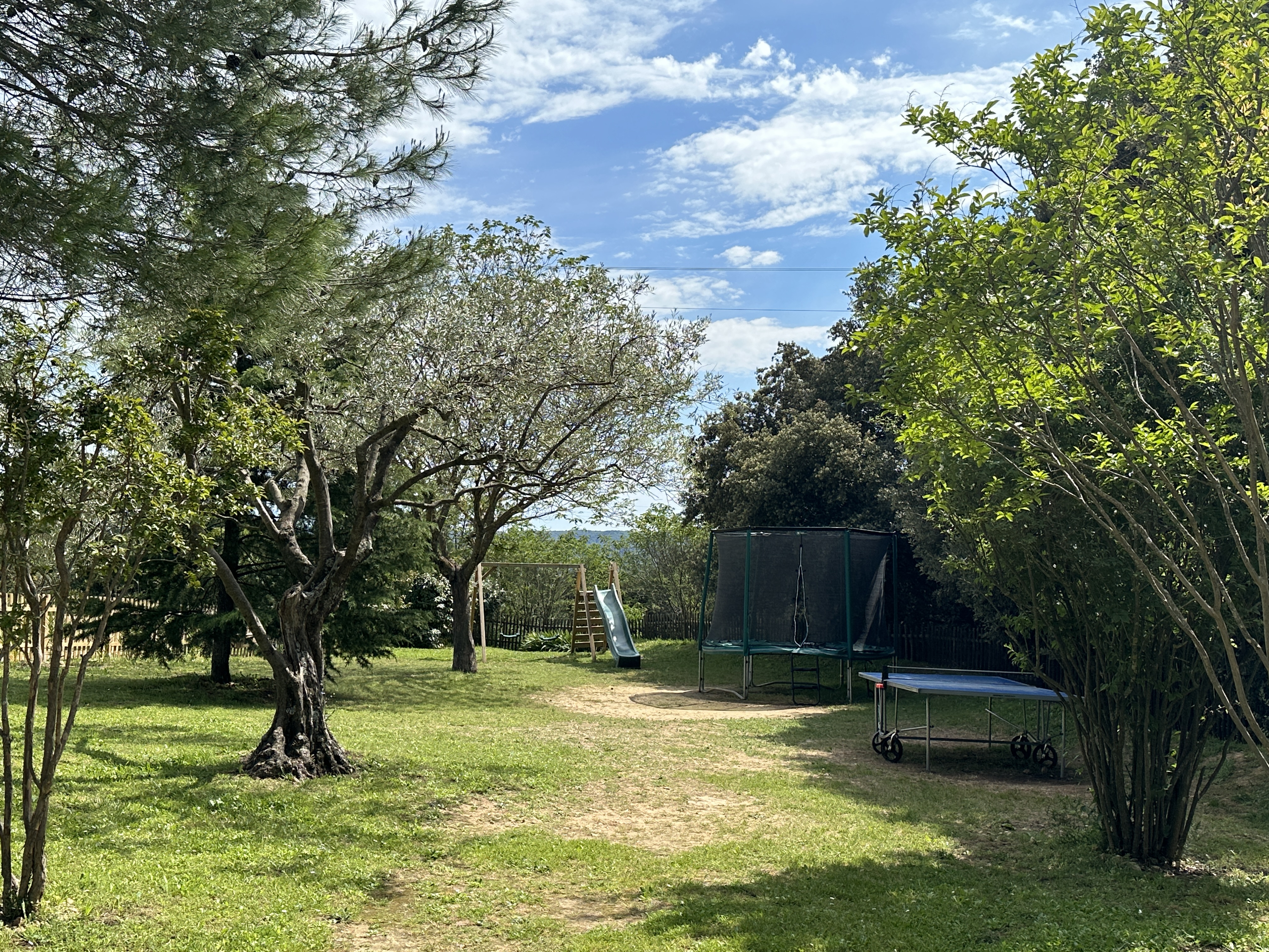 – trampoline, balançoire avec toboggan, table de ping-pong