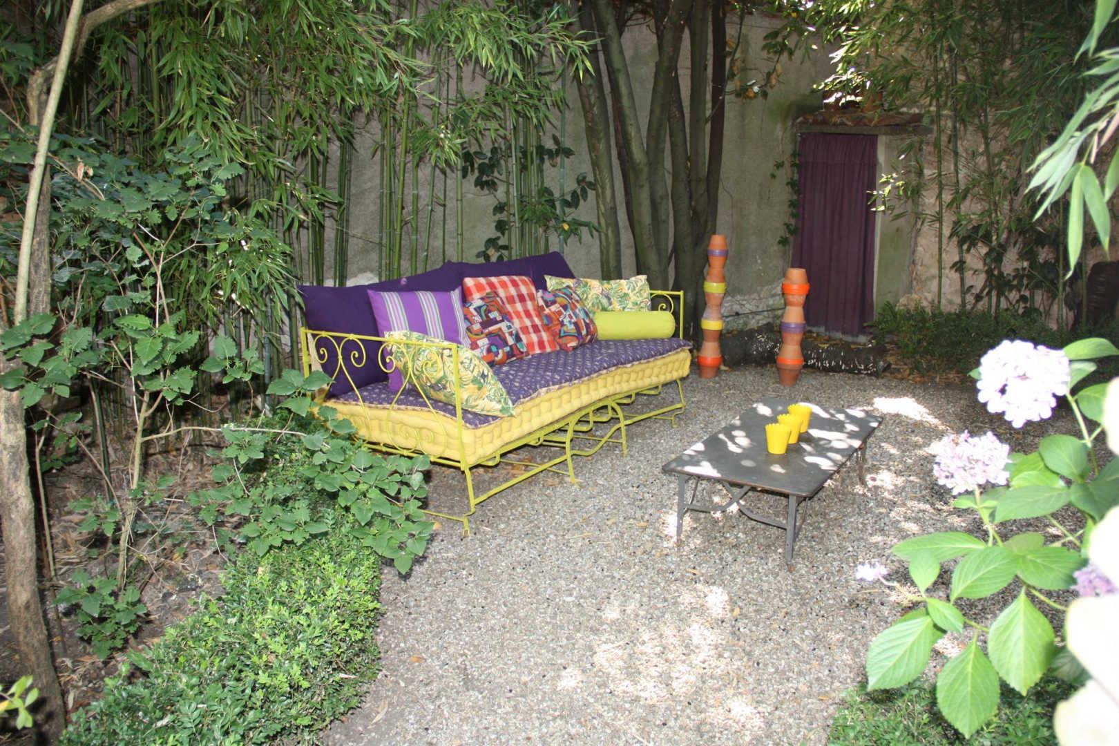 Jardin arboré de 700 m² clos de murs. En plus de la piscine, vous y trouvez entre autres une fraiche tonnelle entourée de bambous et équipée pour vos moments de détente sans oublier un barbecue en pierre. Outre la tonnelle, vous pouvez également utiliser la terrasse en bas du gite pour y prendre vos repas sur la table qui y est à tout moment à votre disposition.