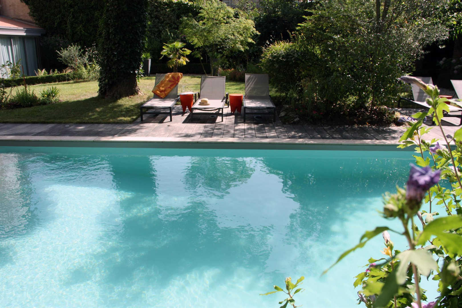Piscine partagée (10×4,5m), chauffée et traitée au sel, avec plage-enfants, à disposition du 30 mai au 27 septembre.