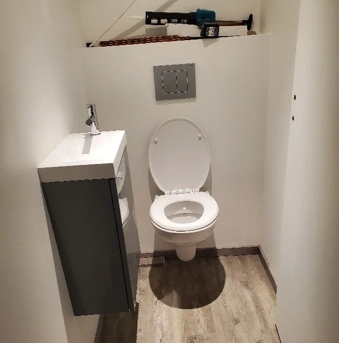 Cuisine ouverte sur séjour, wc indépendant, suite chambre avec placard de rangement et douche à l’italienne, espace bureau.