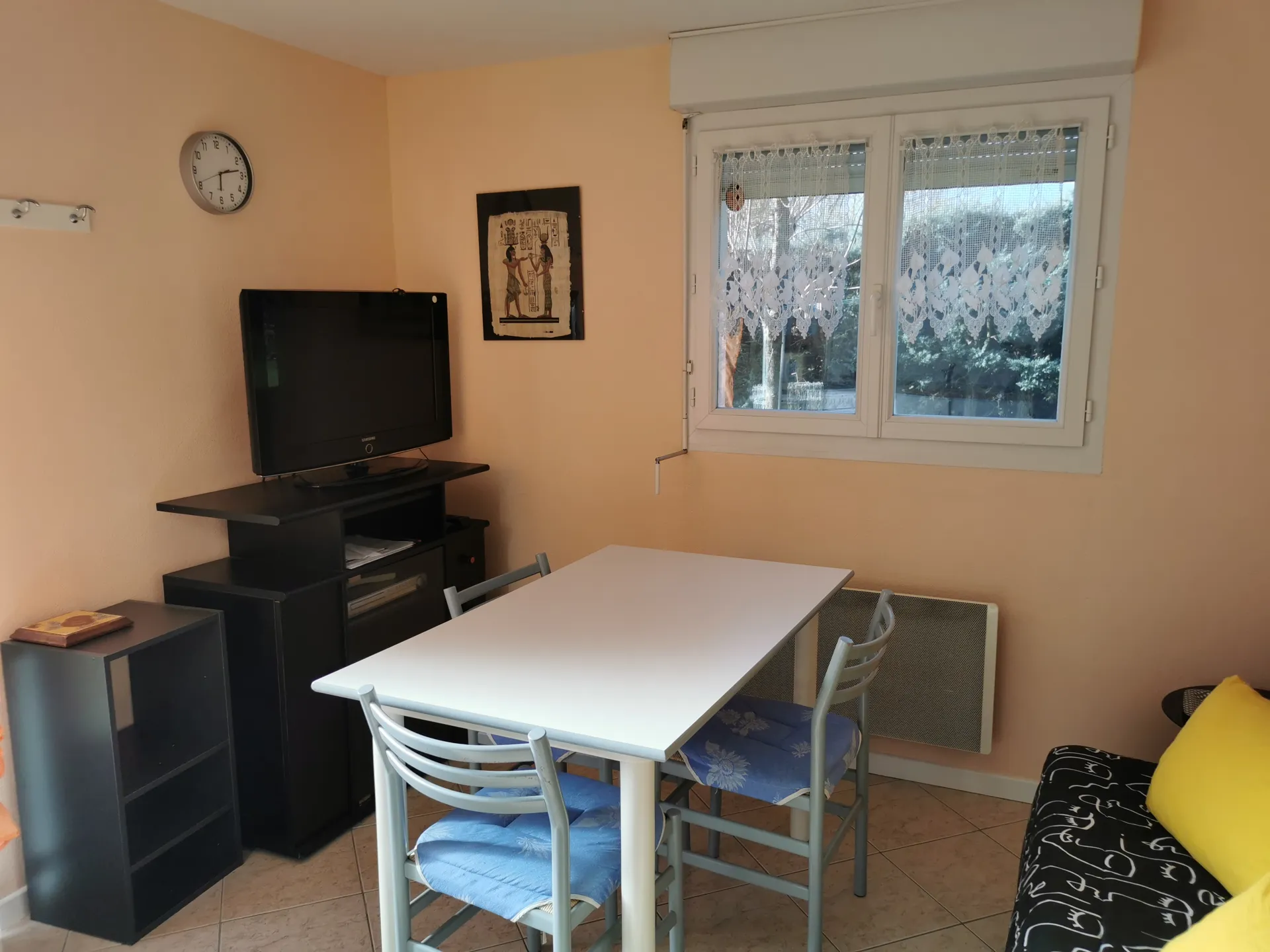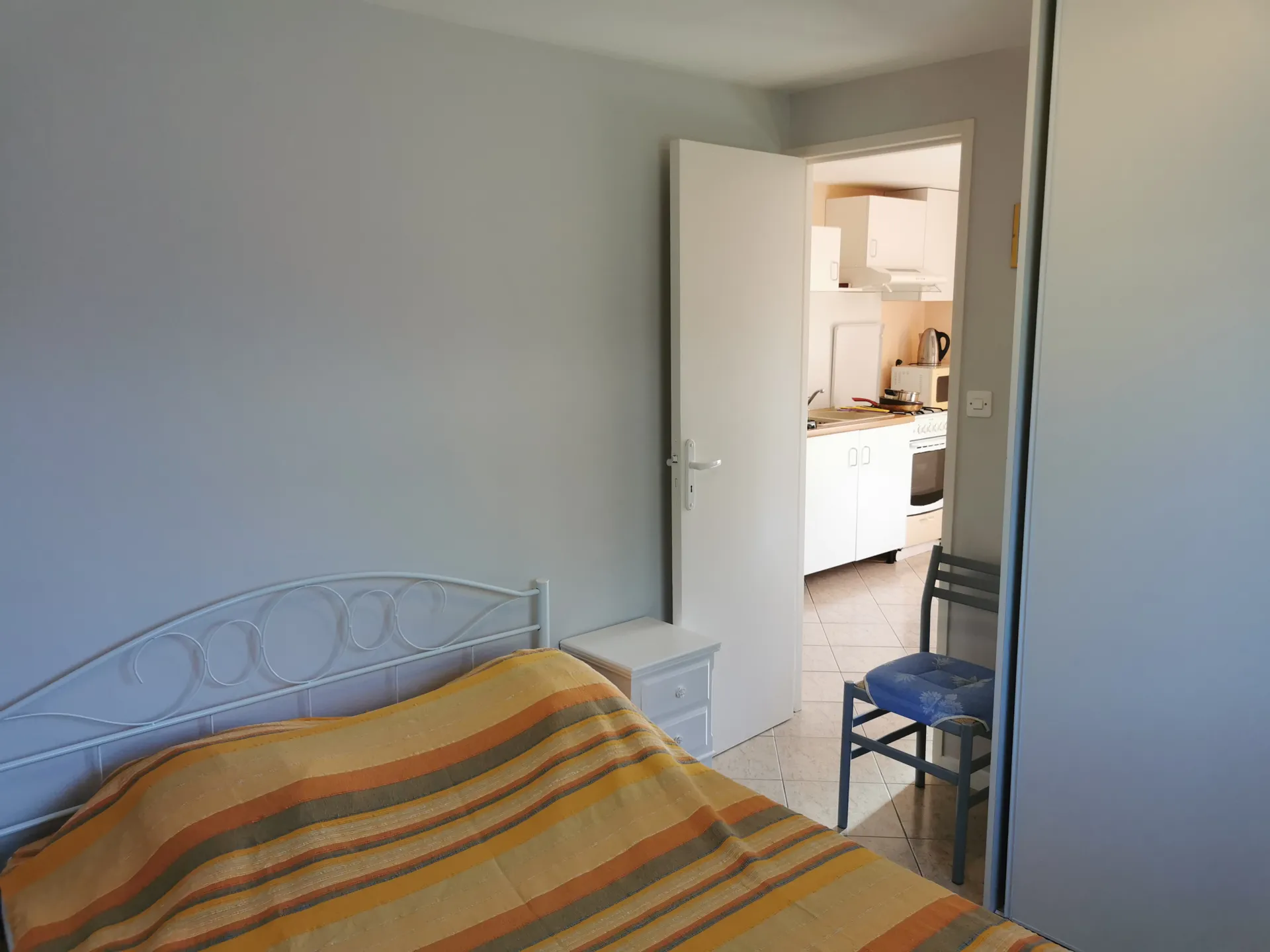 La pièce de vie regroupe le séjour et un coin cuisine avec l’essentiel pour cuisiner. Dans la chambre se trouve un lit 140×190.