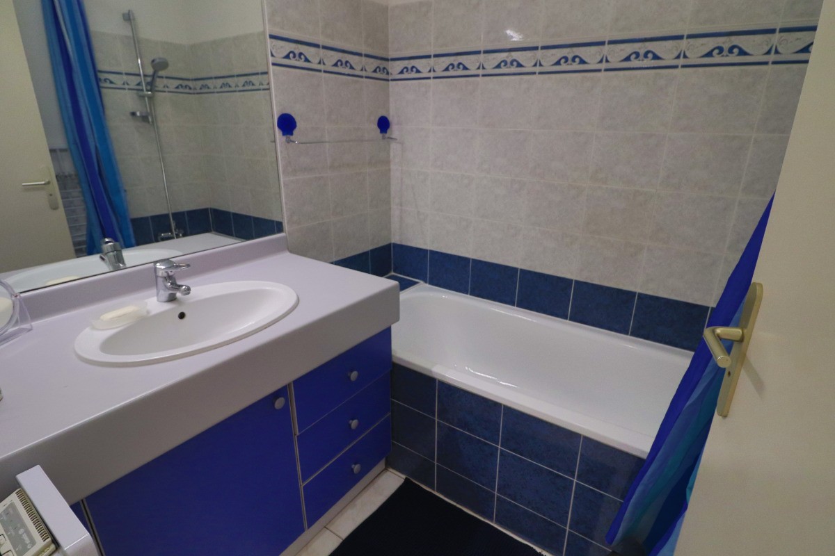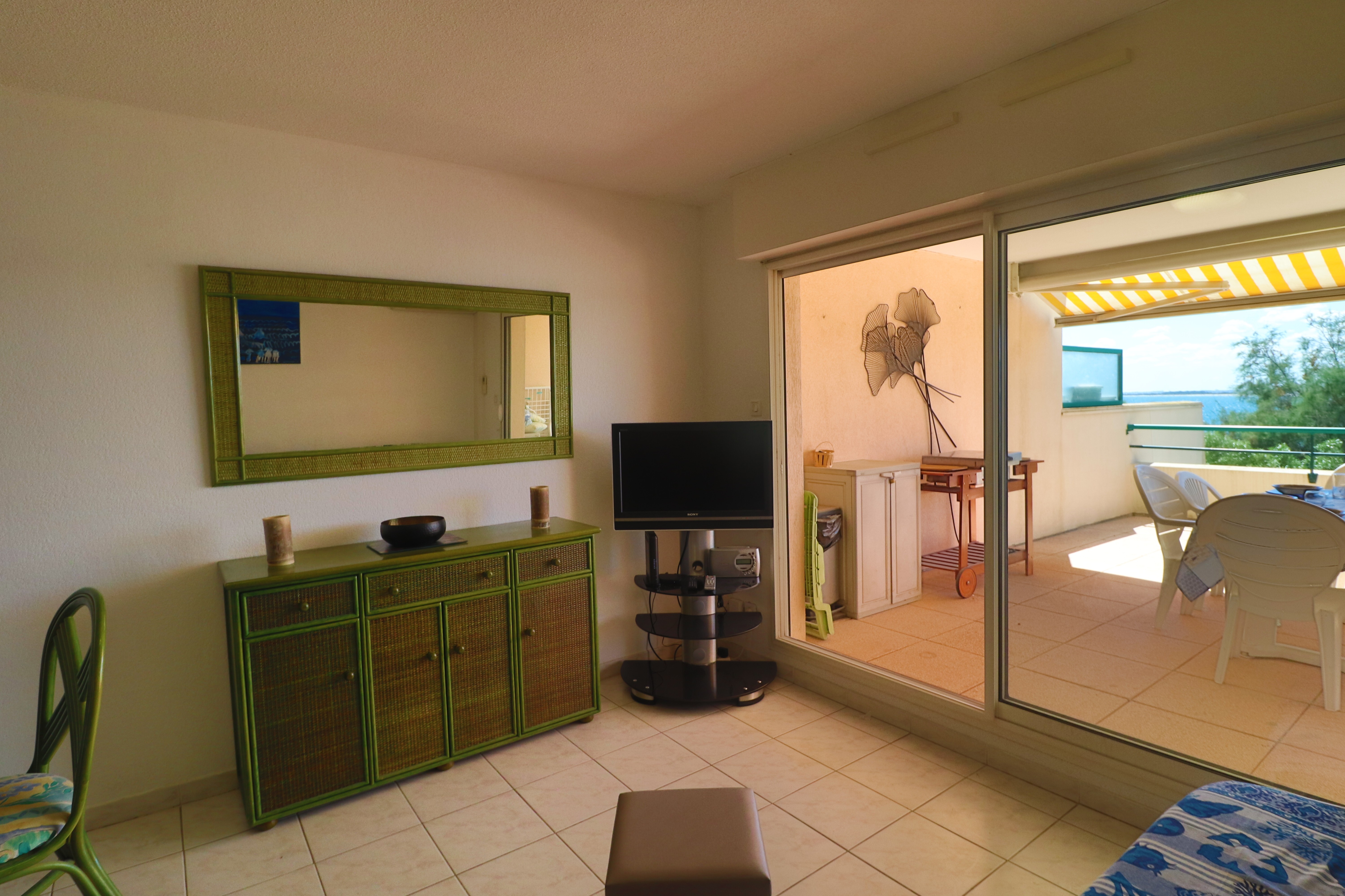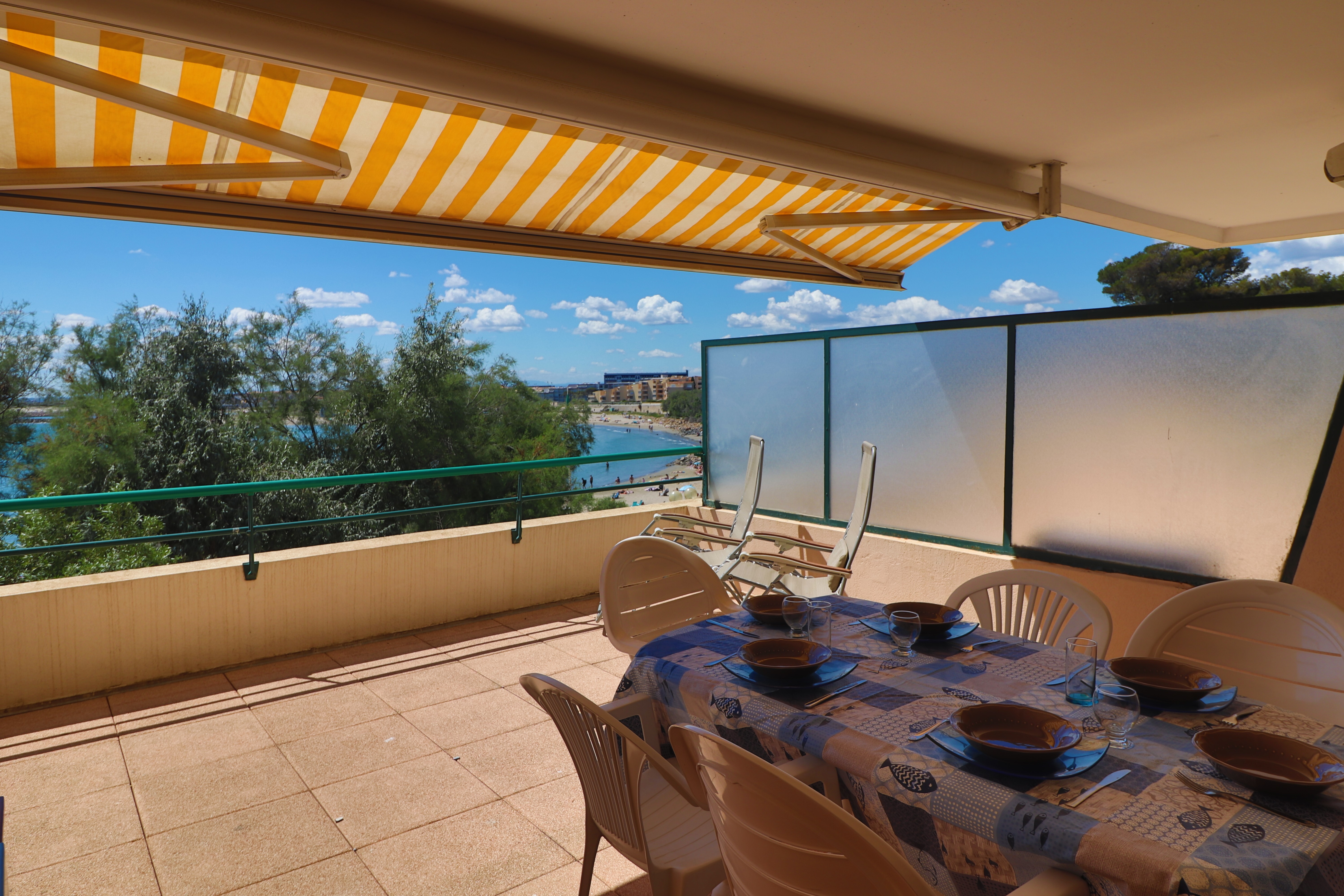 Confortable T2 Cabine prévu pour 4 personnes avec terrasse face à la mer. Séjour climatisé avec canapé clic clac ,télévision et WIFI. Une cuisine équipée avec réfrigérateur, plaques chauffantes vitrocéramiques, un four à micro-ondes, un minifour, un lave-vaisselle et un lave-linge. Une chambre avec un lit double et placard. Une cabine indépendante avec deux lits superposés. Une salle de bains et wc séparés. Une terrasse de 25m² avec salon de jardin et store. Vue sur la plage du Lazaret et la mer.