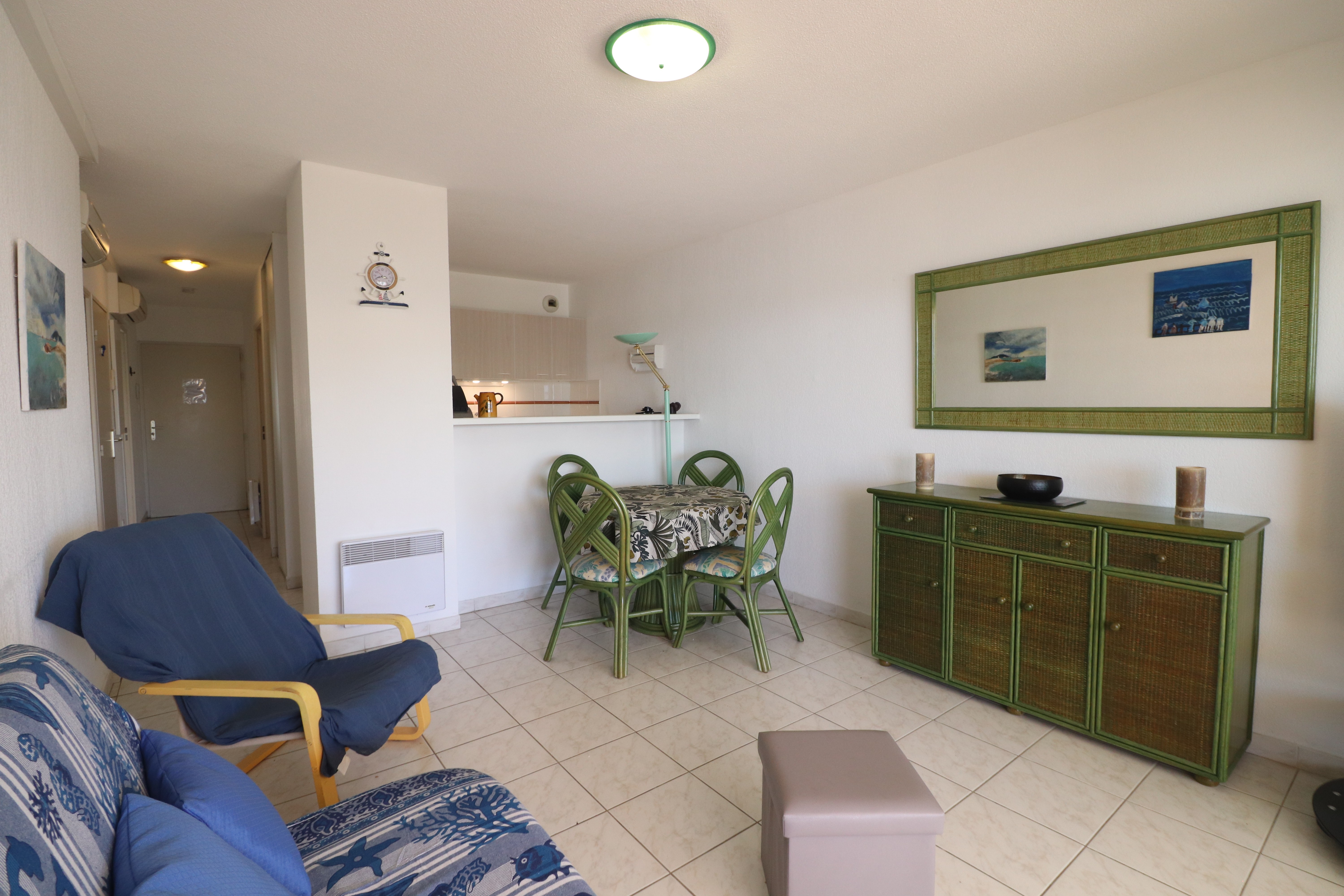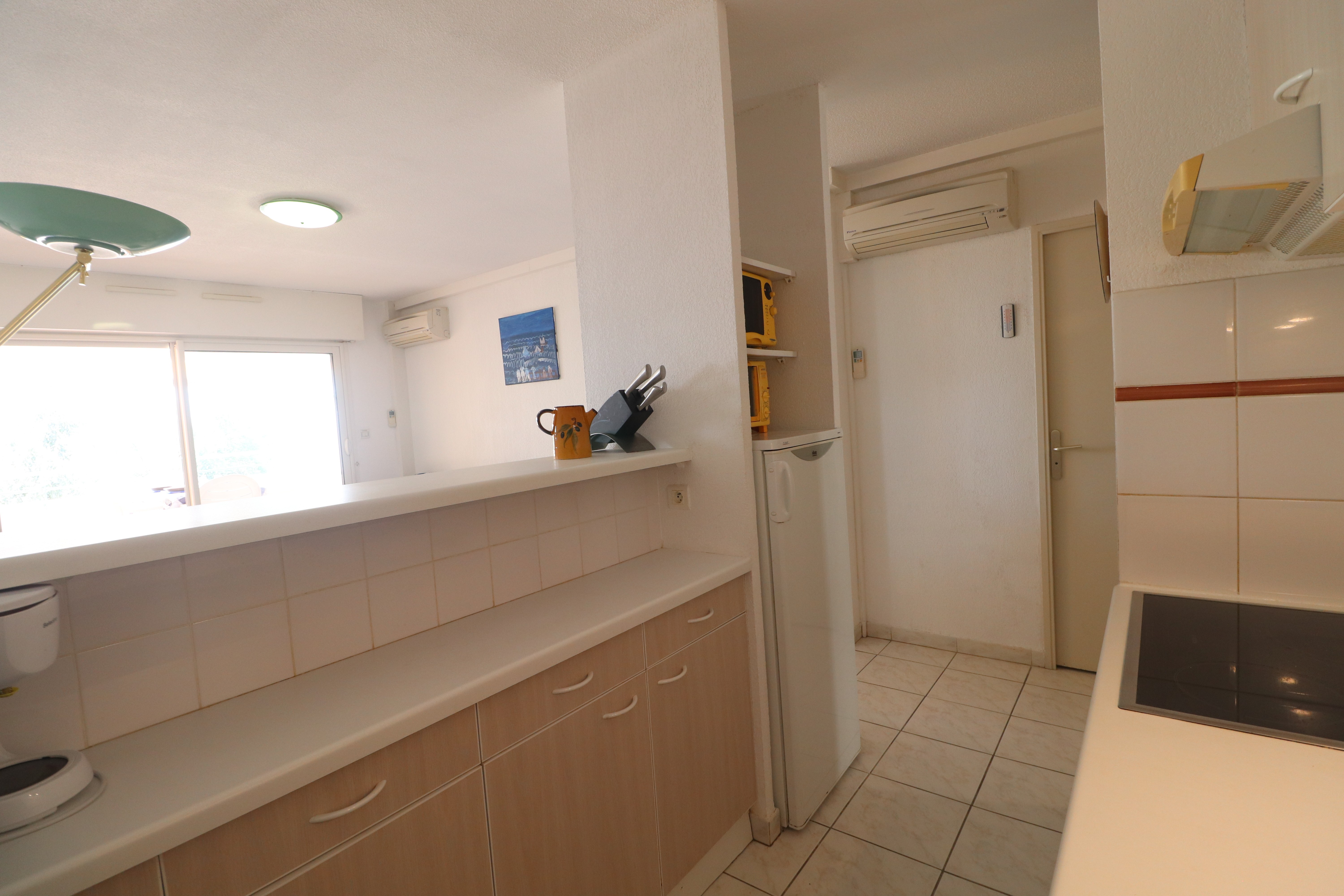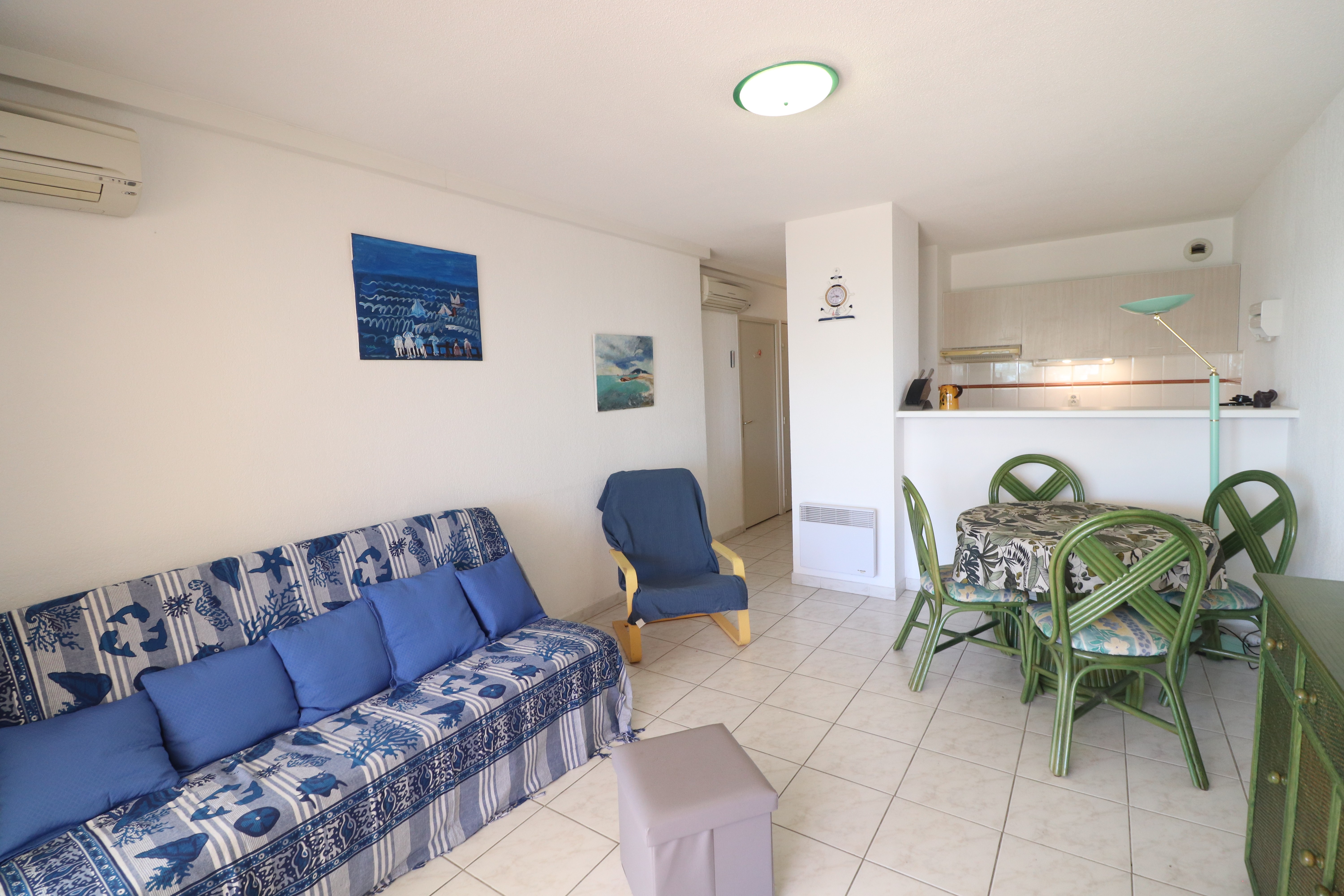 Confortable T2 Cabine prévu pour 4 personnes avec terrasse face à la mer. Séjour climatisé avec canapé clic clac ,télévision et WIFI. Une cuisine équipée avec réfrigérateur, plaques chauffantes vitrocéramiques, un four à micro-ondes, un minifour, un lave-vaisselle et un lave-linge. Une chambre avec un lit double et placard. Une cabine indépendante avec deux lits superposés. Une salle de bains et wc séparés. Une terrasse de 25m² avec salon de jardin et store. Vue sur la plage du Lazaret et la mer.