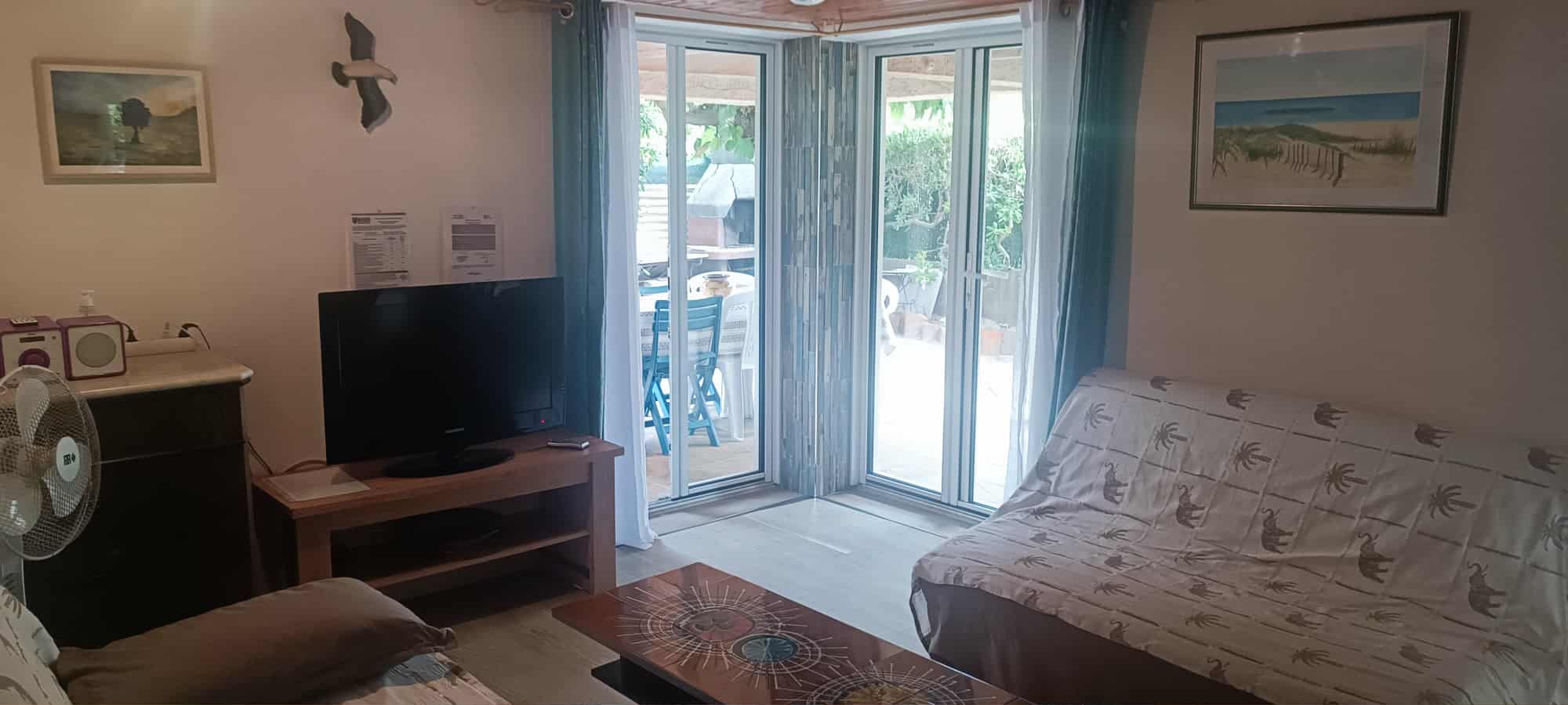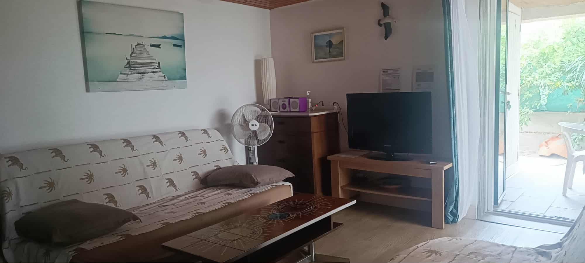 Salon : TV écran plat TNT, 1 BZ et 1 clic-clac. Salle d’ eau : douche à l´italienne avec jets multifonction, WC. Terrasse avec salon de jardin, abri couvert, barbecue.