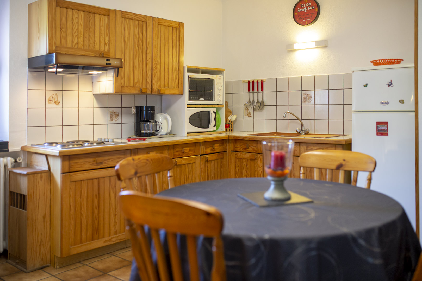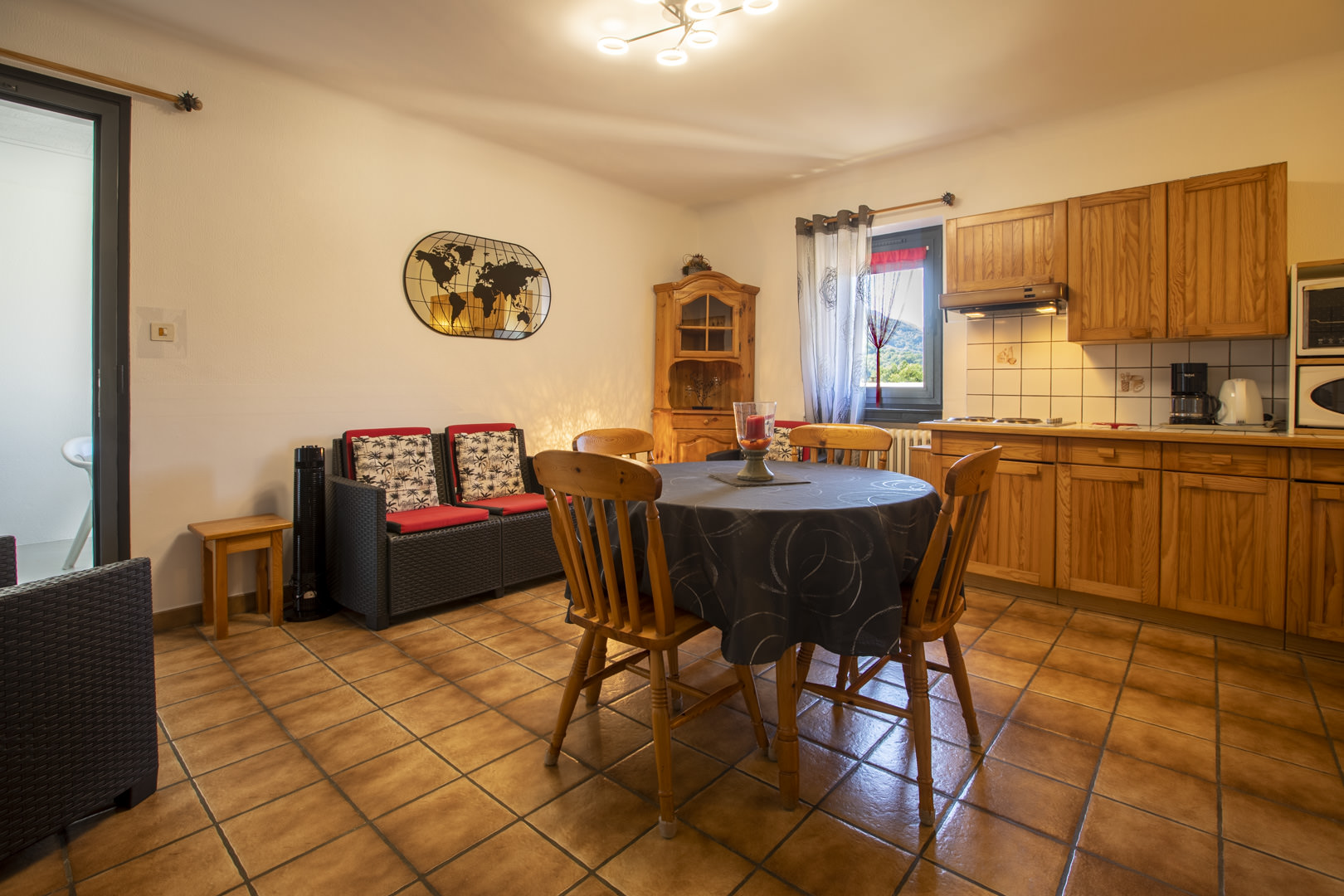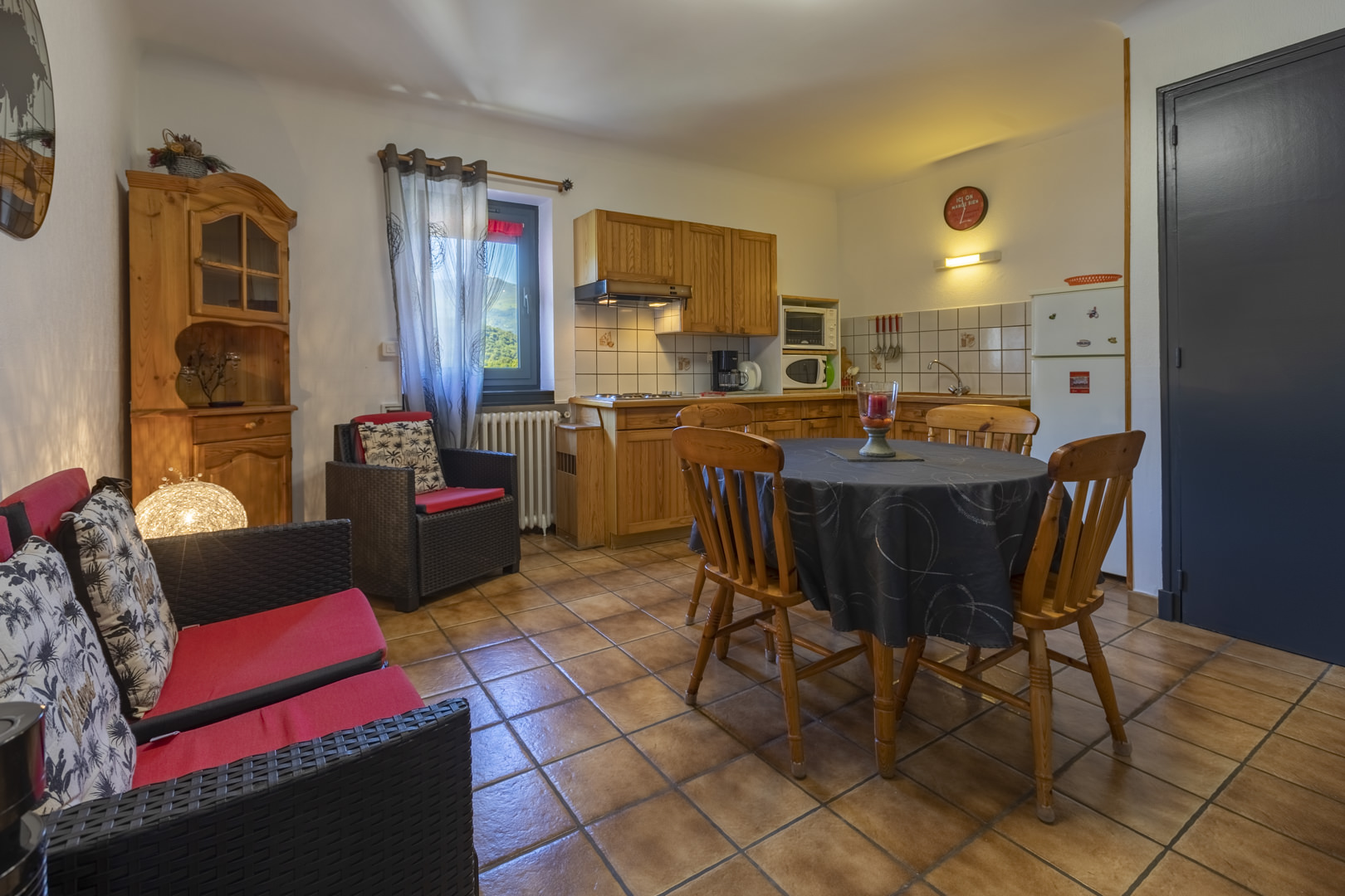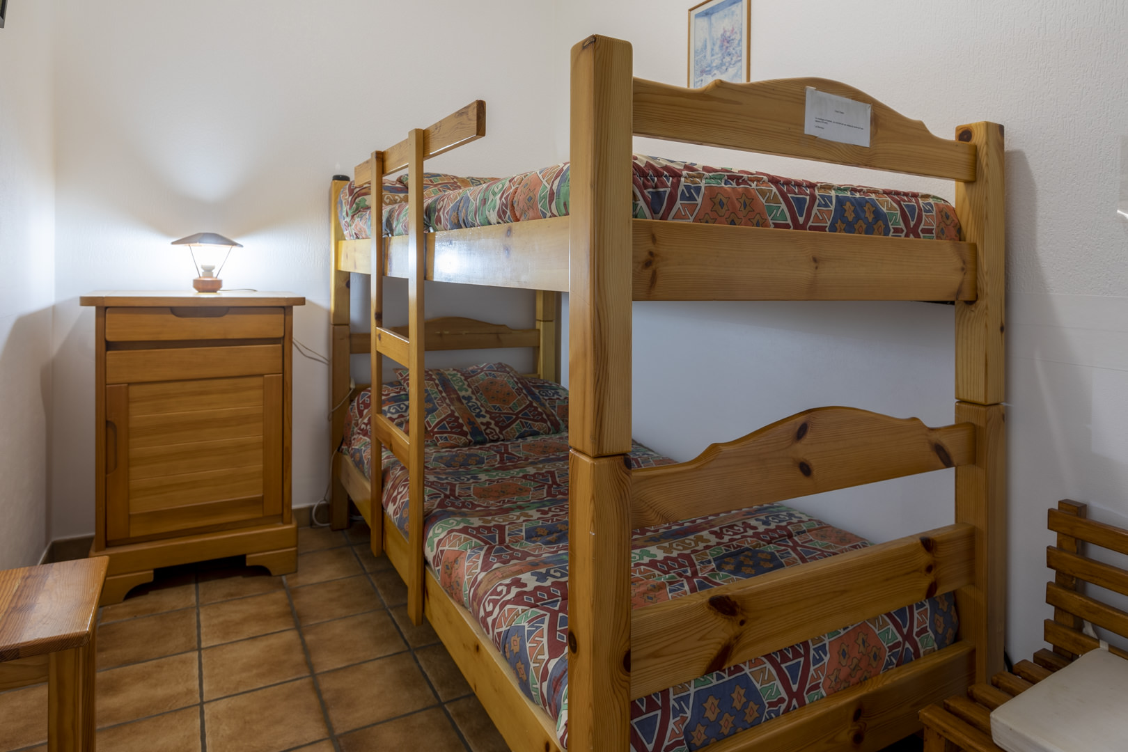 Appartement de 46 m² comprenant : Une pièce de vie avec coin salon, coin salle à manger et cuisine ouverte, 2 chambres (2 lits en 140), une alcôve (2 lits en 90 superposés), une salle d’eau (douche) et WC indépendant. La location bénéficie d’une véranda et d’une terrasse, d’un local à ski/vélo et d’un parking privé.