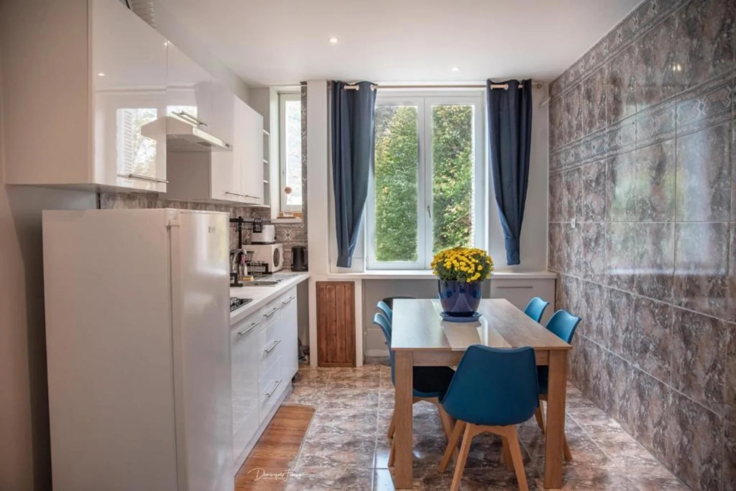 – Une cuisine équipée (lave-linge, four, micro-ondes, gaz).