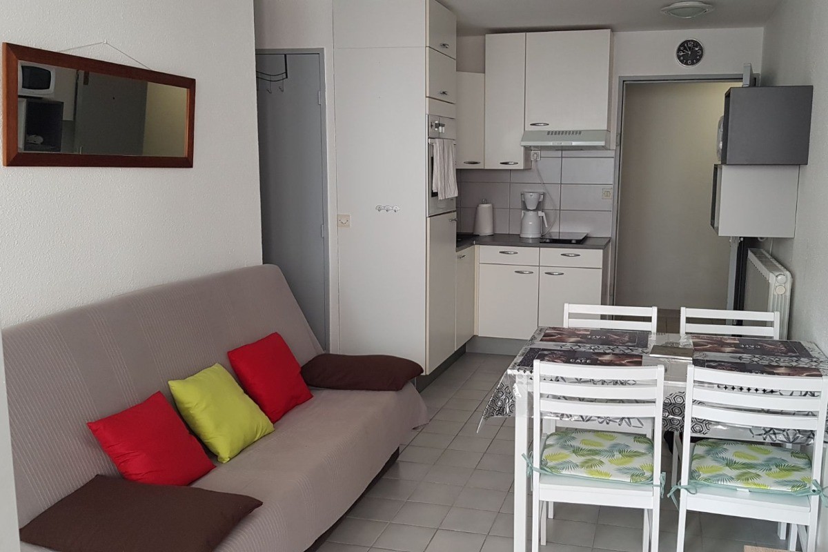 Idéalement situé dans une résidence calme et sécurisée, cet appartement T2 cabine de 30 m² avec une loggia fermée de 5 m² offre tout le confort nécessaire pour un séjour agréable. Situé au deuxième étage, il bénéficie d’un accès direct à la piscine de la résidence, ouverte du 1ᵉʳ juin au 15 septembre. Le parking privé et sécurisé garantit une tranquillité supplémentaire. L’appartement est composé d’une cuisine entièrement équipée avec plaque à induction, réfrigérateur, micro-ondes, four, cafetière, vaisselle et lave-linge. Le salon dispose d’une table avec quatre chaises ainsi qu’un canapé convertible offrant deux couchages supplémentaires. La chambre comprend un lit deux places et une armoire de rangement. La salle d’eau est équipée d’une grande douche et d’un lavabo, avec des WC séparés. La loggia, aménagée et fermée, permet de profiter d’un espace supplémentaire avec une tablette murale, trois grands tabourets, une petite table et deux chaises. Grâce à sa localisation idéale, les plages sont accessibles à seulement 1,5 km et desservies par un arrêt de bus situé au pied de la résidence. Les commerces de proximité et les transports en commun permettent de rejoindre facilement le centre-ville, la gare et les villages alentour. Cet appartement est disponible en location saisonnière de Juillet à Septembre à partir de 480 € par semaine. Les animaux ne sont pas admis.