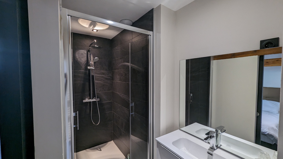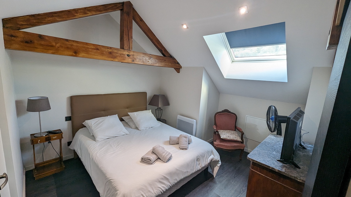 – La troisième chambre à l’étage avec un grand lit en 160 cm et une salle de bain privative