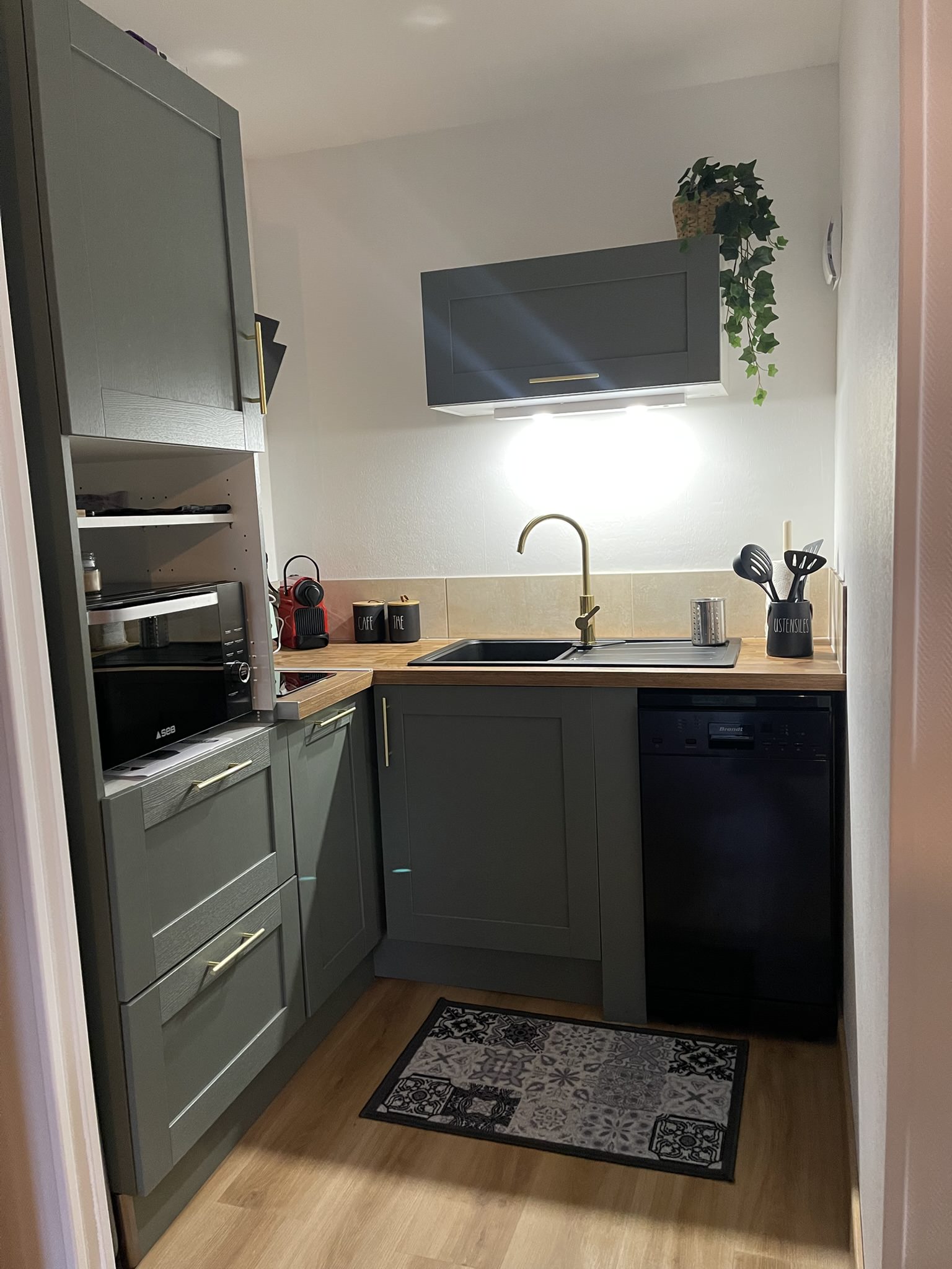 Coin cuisine équipé. 1 chambre avec 1 lit 160.