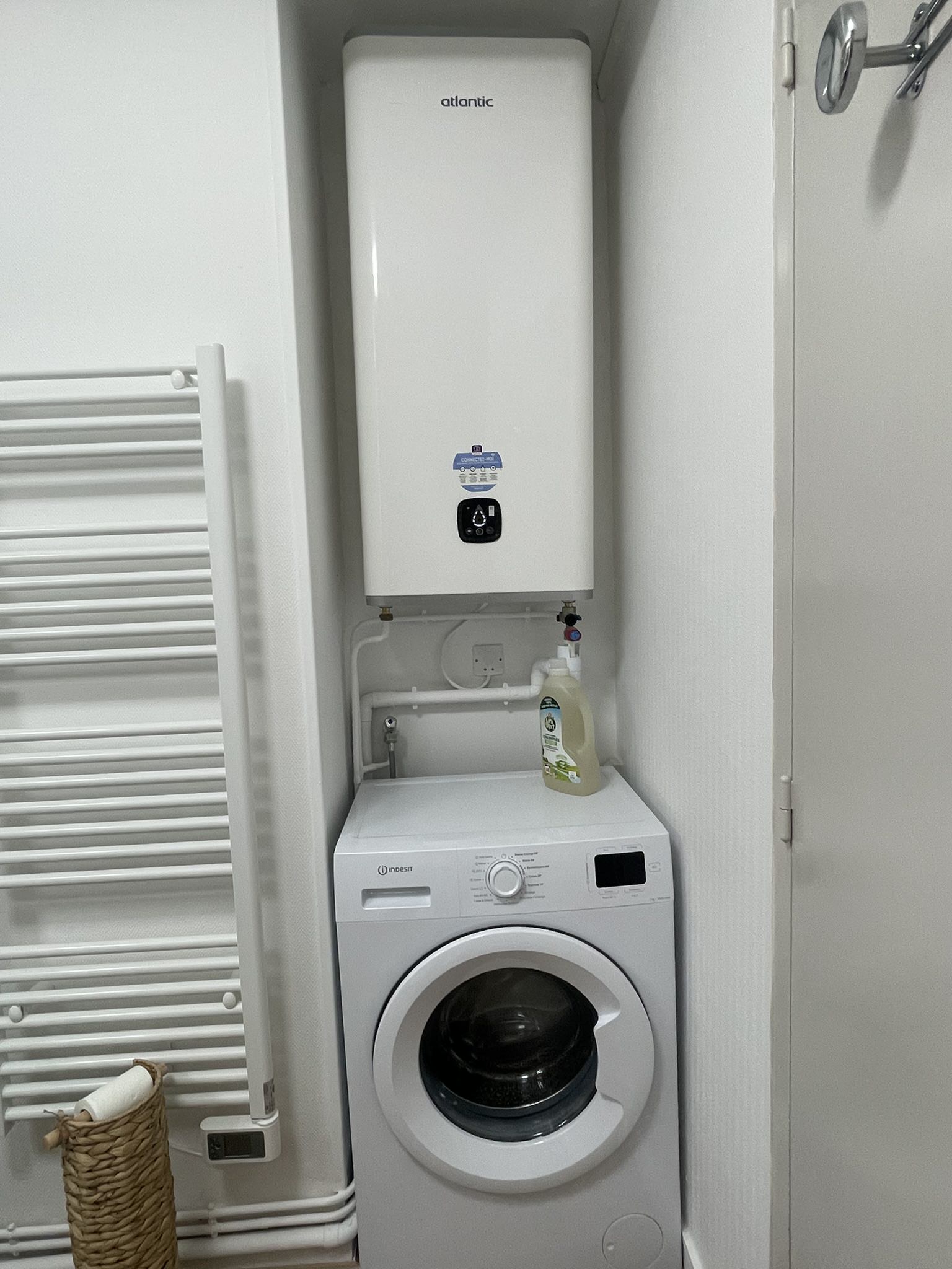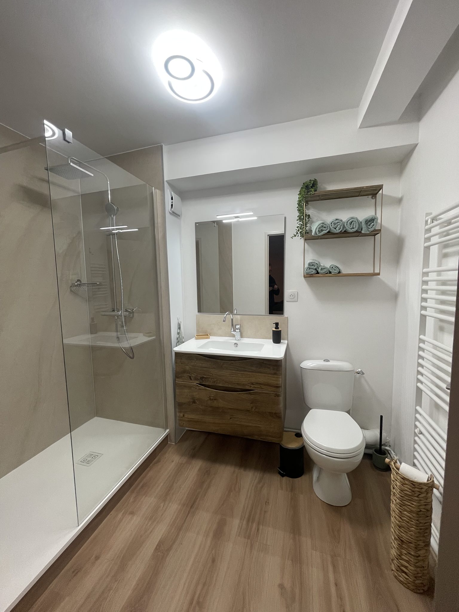 Salle d’eau avec douche à l’italienne, vasque, wc ,machine à laver le linge.
