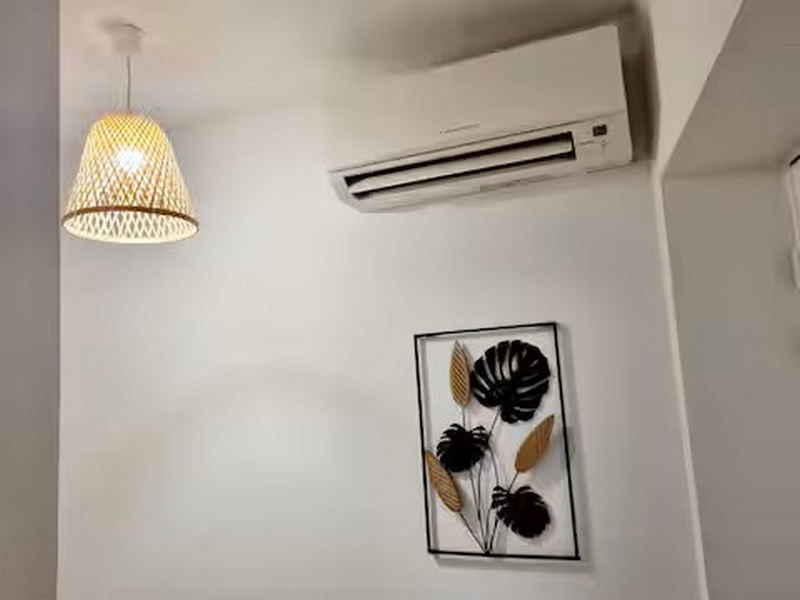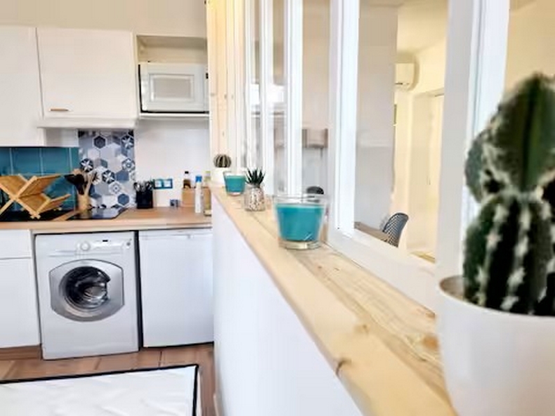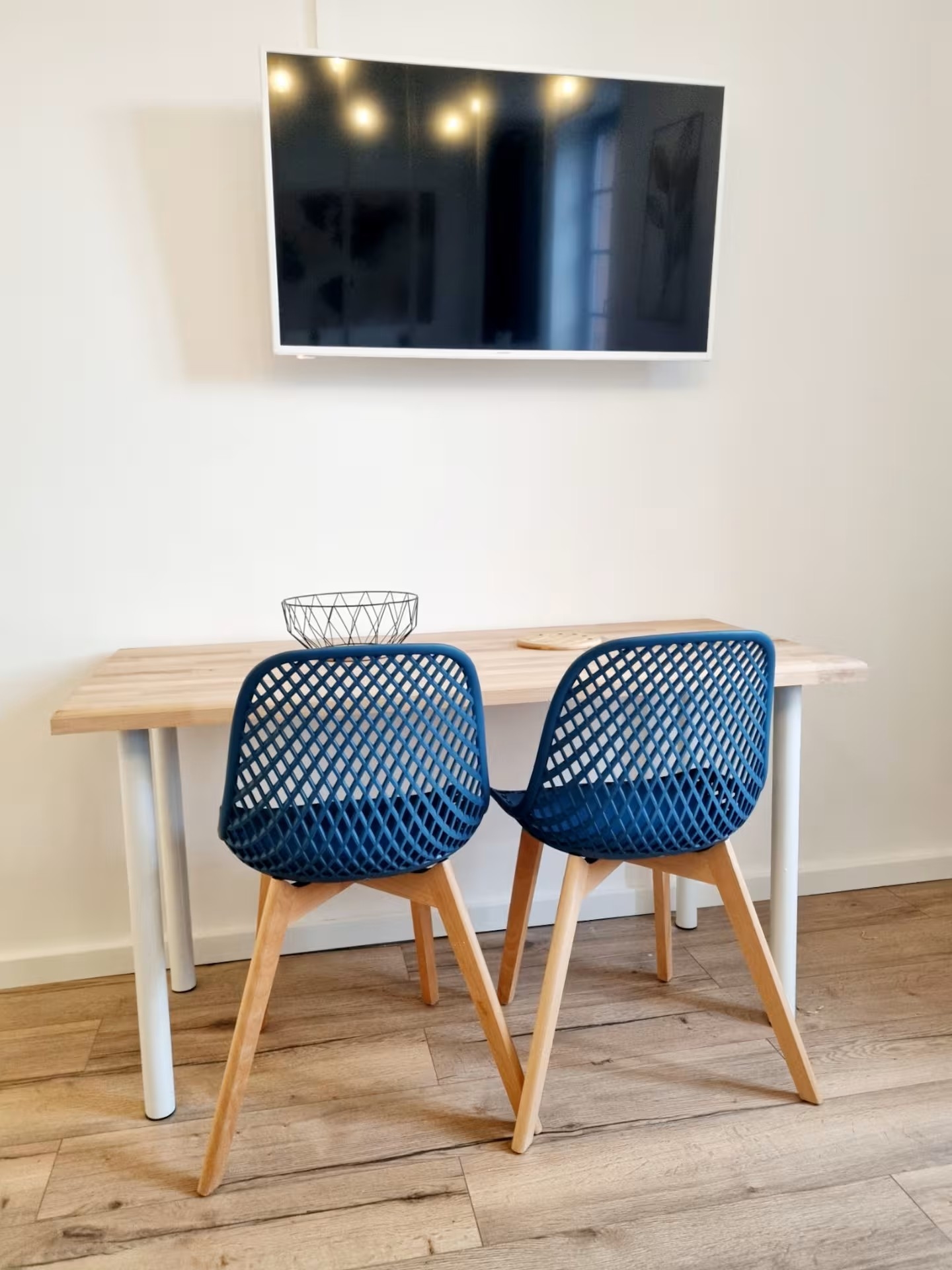 Appartement avec une chambre (non fermée) en alcôve (140×190), une cuisine toute équipée donnant sur le salon avec un canapé convertible (140×190), un coin petit déjeuner et une télévision UHD. Le tout attenant a une douche, un lavabo et des WC.