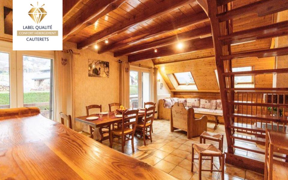 Cet appartement ambiance « chalet » situé à 800m du centre-ville, des Thermes et de la télécabine du Lys a tout pour vous séduire ! Ce bel hébergement à l’âme montagnarde au 1er étage de la maison du propriétaire dispose d’un très bel espace de vie : cuisine ouverte sur le salon, totalement équipée. Côté couchage : 1 chambre avec un lit en 140cm, 1 chambre avec deux lits en 90cm et une mezzanine avec un lit en 140cm. Et pour vous éviter les embouteillages du matin : 2 salles d’eau avec douche et WC indépendants sont à votre disposition. Vous serez également séduit par son extérieur (balcon, salon de jardin, barbecue, parking) et surtout par sa vue (depuis toute les pièces) sur les montagnes environnantes. .