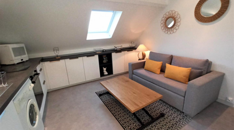 Séjour avec coin cuisine et salon, 1 chambre (1 lit 2 places), jardin clos.