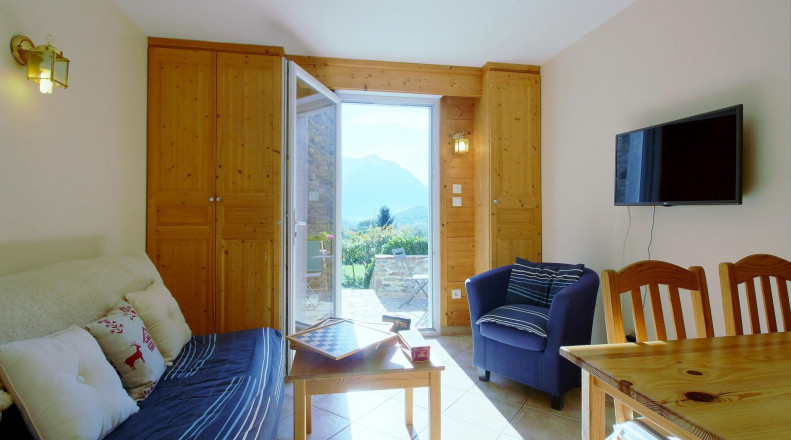 Gîte au rez de chaussée de la maison de vacances des propriétaires occupée occasionnellement, sans vis à vis, entrée totalement indépendante, situé à l’entrée d’un village typique de montagne et bénéficiant d’un point de vue exceptionnel sur la vallée de Luz St Sauveur et les montagnes. 1 chambre (1 lit 2pl.), salle à manger/coin cuisine/coin salon, salle d’eau+wc, lave linge et sèche linge communs, terrasse, terrain non clos, salon de jardin barbecue. Chauffage central au sol inclus. .
