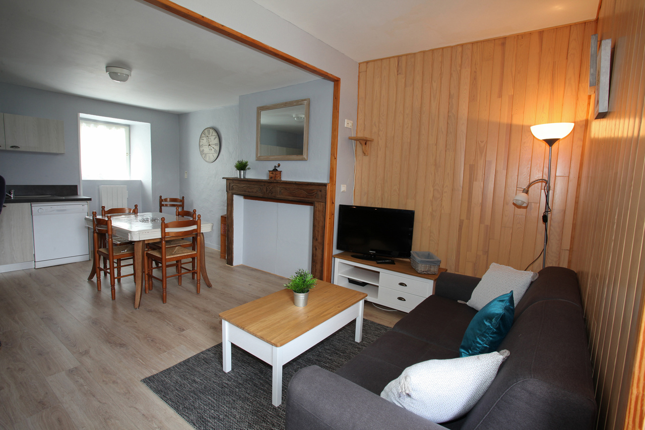 Appartement de 61m² pour 6 personnes comprenant : Au Rdc : un salon ouvert sur la cuisine (réfrigérateur/congélateur, four, micro-ondes, plaque induction, lave linge, lave vaisselle, TV), un coin nuit avec 1 lit en 140, une salle d’eau avec douche et lavabo. WC indépendant. A l’étage : une chambre avec 1 lit en 140 et une autre avec 2 lits en 90. La location bénéficie d’une cour non clôturée avec salon de jardin.