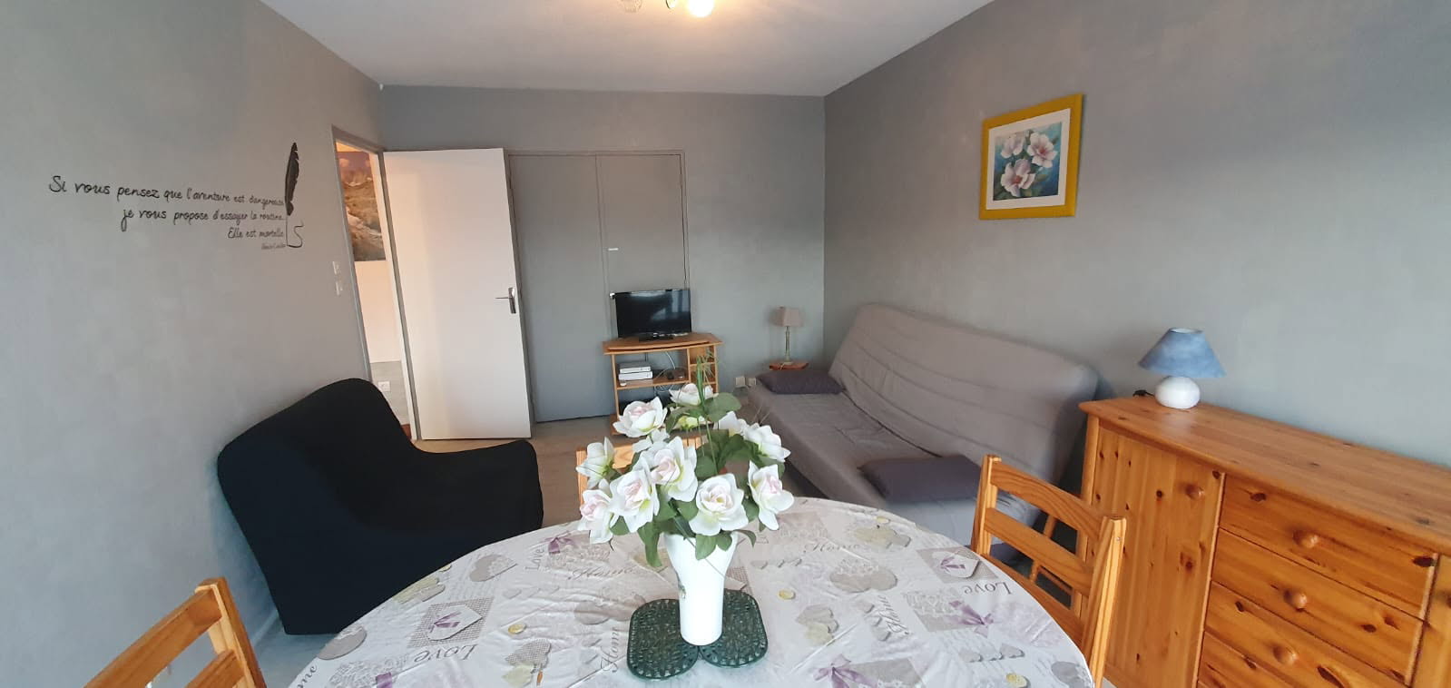 Appartement situé au 4ème étage d’une résidence avec ascenseur. Cuisine indépendante, une chambre avec un lit en 140, séjour indépendant avec canapé BZ et balcon. Salle de bains avec baignoire et WC, Lave-linge. Wifi gratuit, accès internet.