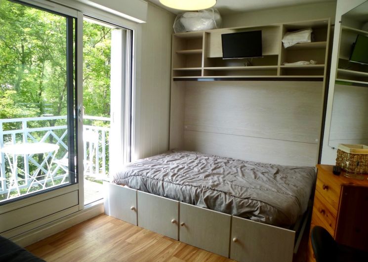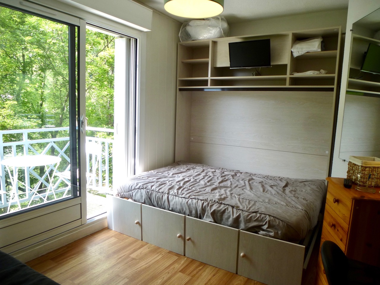 Studio lumineux de 21.50 m2 comprenant : Un séjour avec lit rabattable en 160 cm et un canapé BZ, d’une kitchenette avec lave-vaisselle et lave-linge, d’une salle d’eau, d’un WC indépendant. La location bénéficie d’un parking extérieur.