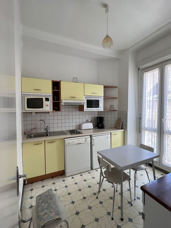 Location uniquement l’été. Résidence rénovée à 5 mn du centre ville. Appartement avec balcon, 1er étage, superficie : 45 m2. Hall d’entrée. Cuisine, plaques électriques, réfrigérateur, four, micro-ondes, auto-cuiseur, aspirateur, cafetière électrique, hotte aspirante. Planche et fer à repasser. Séjour, 1chambre avec 2 x 90 cm, 1 x 140 cm. Douche, wc indépendants. Télévision couleur, lave linge commun, lave vaisselle. Terrasse, jardin clos, salon de jardin, boîte aux lettres. .
