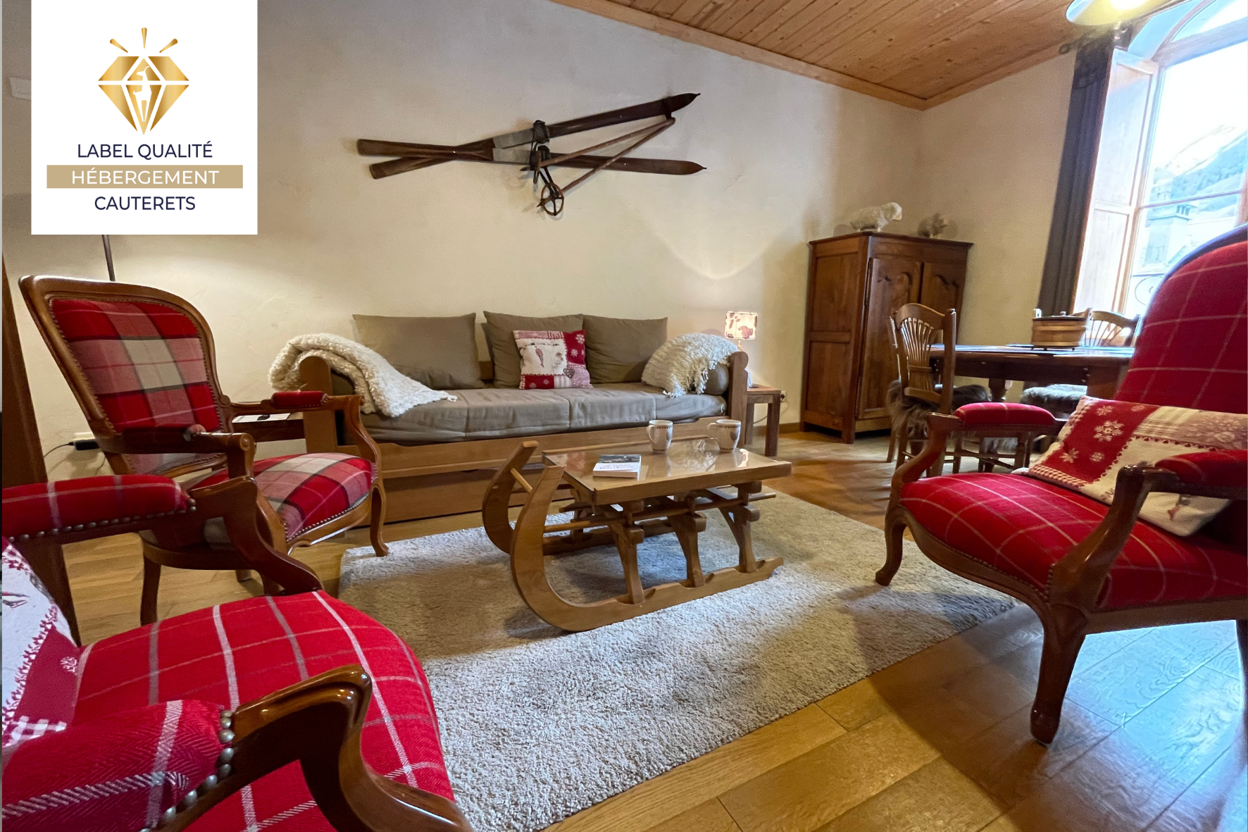 Appartement au cœur du village, entièrement rénové, situé au 4ème étage avec ascenseur d’un immeuble datant de 1880 dont la façade est classée monument historique. 2 chambres ayant chacune leur propre salle de bain et toilettes. Une salle de bain est équipée d’une douche et l’autre d’une baignoire. Une chambre a une literie en 160 cm et l’autre 2 lits en 1 mètre. Télévision dans chaque chambre ainsi que dans le salon. Cuisine entièrement équipée, four, micro ondes, lave vaisselle, robot, machine à café Nespresso, appareil à raclette. Salon avec canapé et fauteuils et table salle à manger. Lave linge et sèche linge. Vue sur les montagnes. Local à skis pouvant accueillir également des vélos. Parking public gratuit à proximité. .