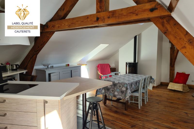 Idéal pour 4 à 5 personnes, en famille ou en couple. Appartement spacieux et très lumineux de 85m2 avec vue sur les montagnes. Entièrement rénové dans une résidence familiale calme en plein cœur de Cauterets. Commerces à proximité. Télécabine accessible à pied. Centre thalasso à 2 minutes. Profitez de cet appartement avec sa grande pièce de vie ouverte sur la cuisine et son ilot central, son coin salle à manger et son salon avec un poêle à granulés. Situé au 3eme étage avec velux, fenêtres et baies vitrées vous donnent une vue à 180° sur les montagnes. .