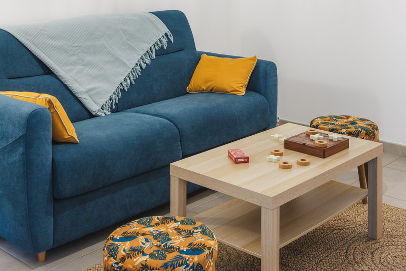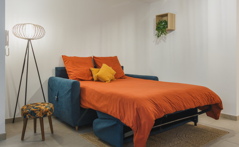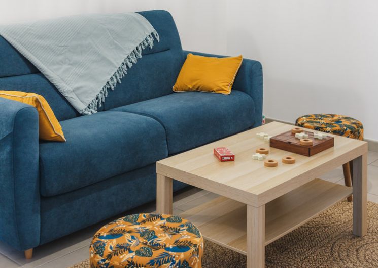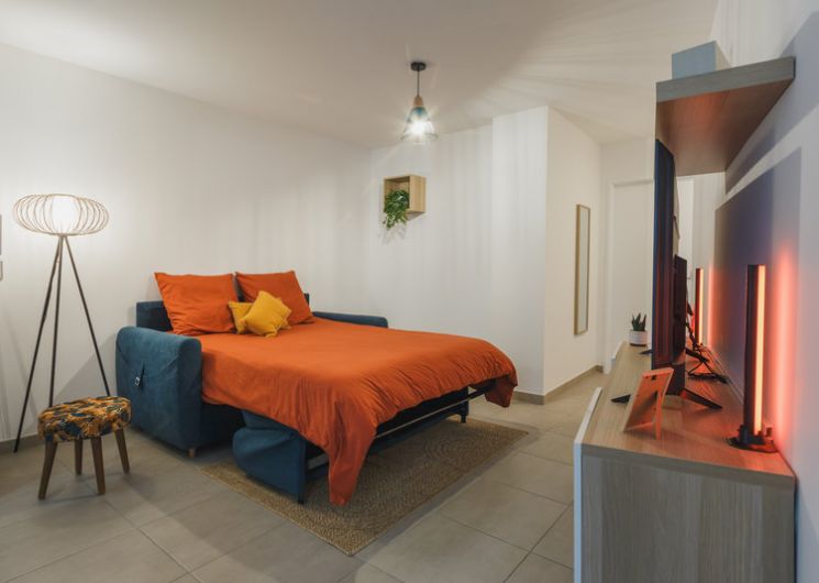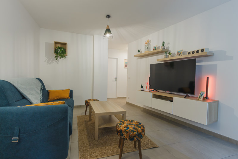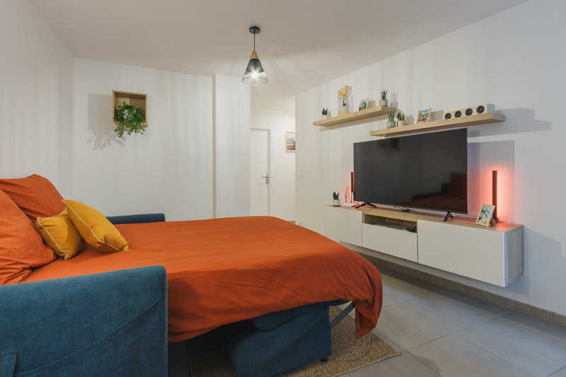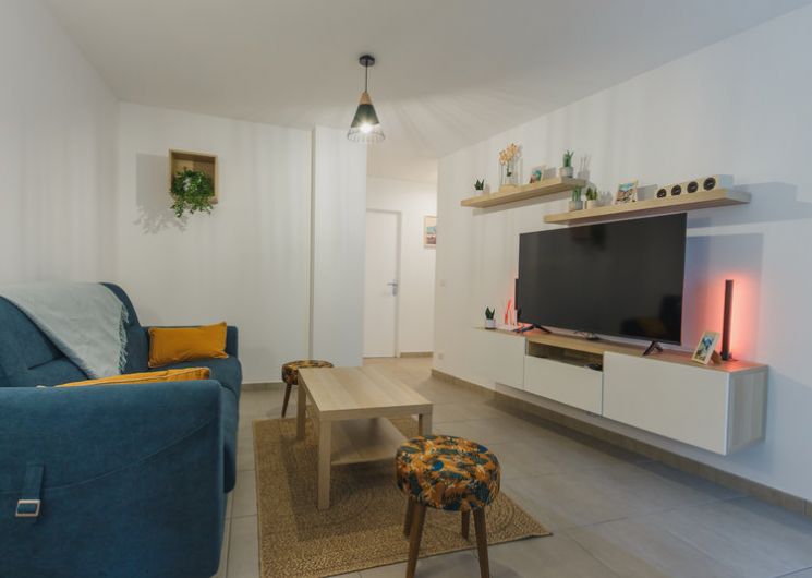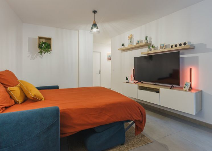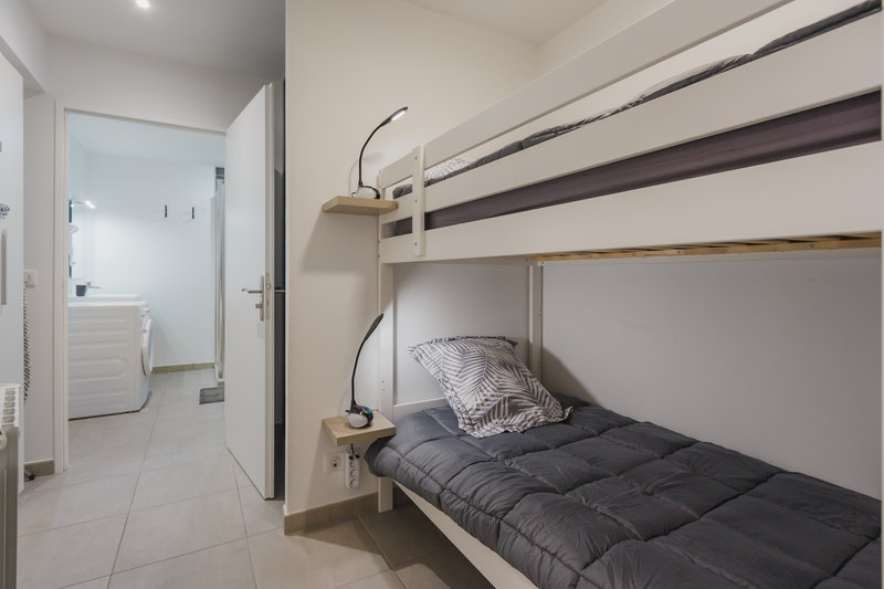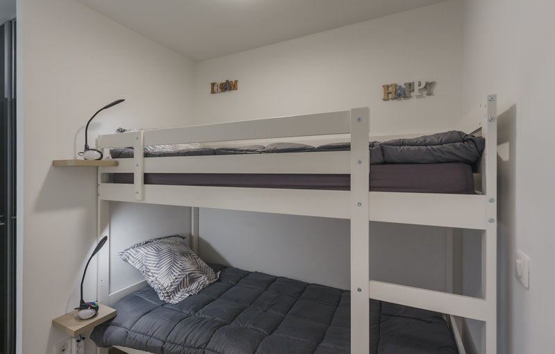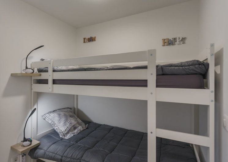 Chambre 1 : Lit en 160cm Coin nuit : 2 lits superposés Séjour : Canapé lit type rapido