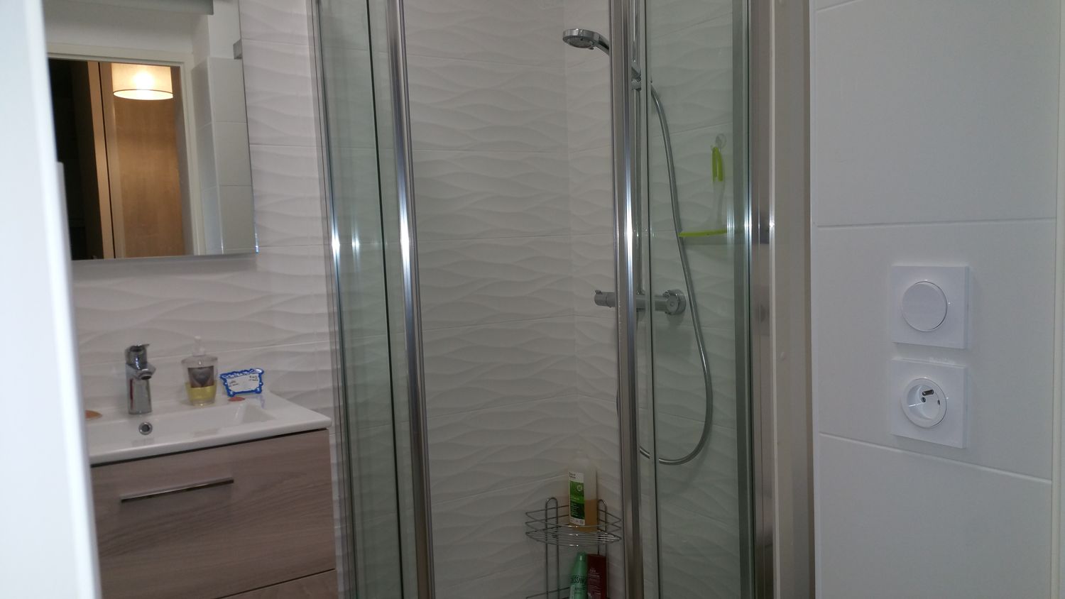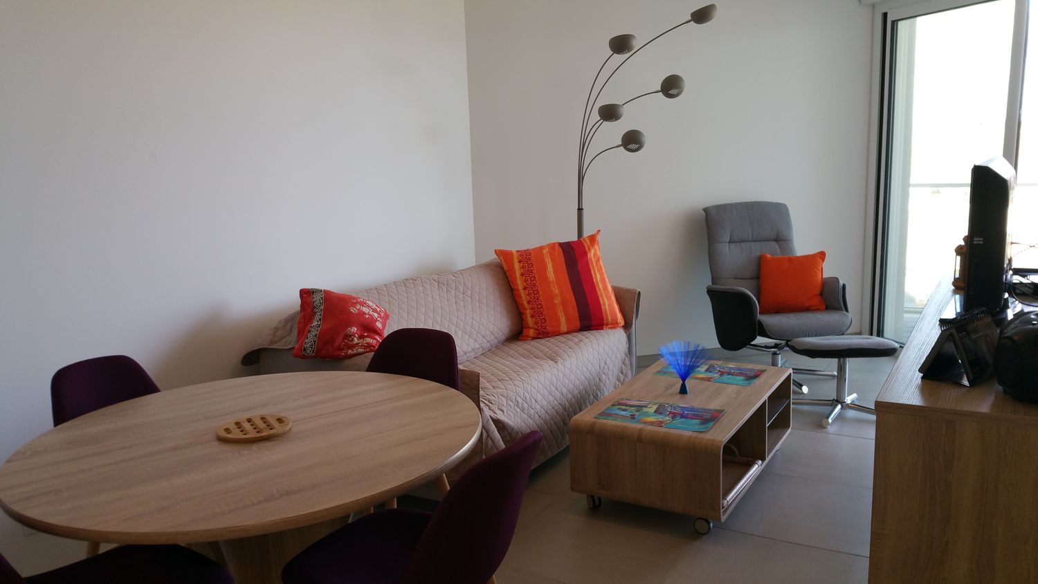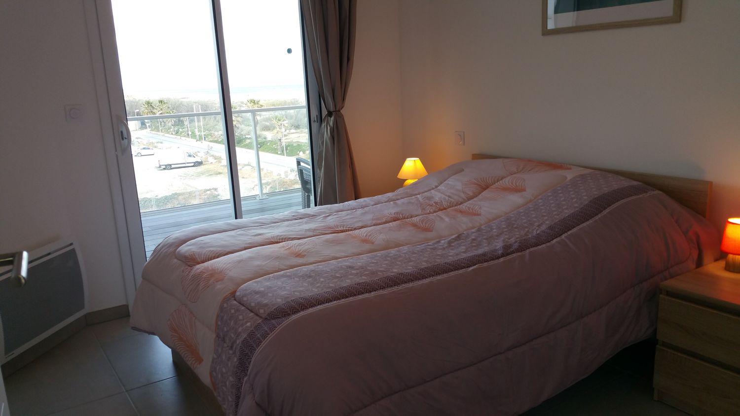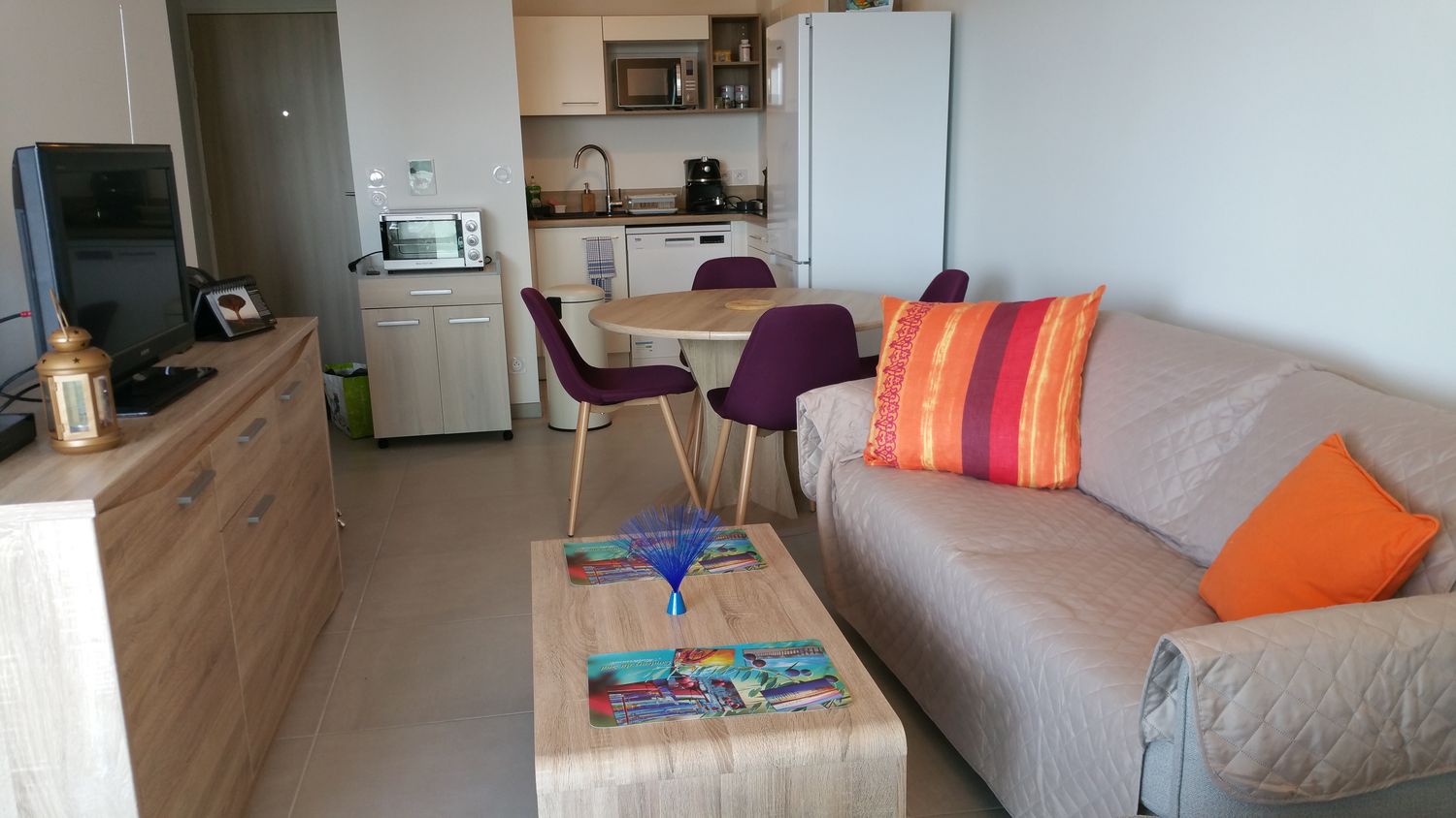 Appartement 2 pièces de 37 m² situé au 3ème étage, offrant un aménagement optimisé. Il comprend un séjour/salle à manger équipé d’un canapé-lit double (140×190 cm), d’une TV à écran plat, d’une radio, d’un lecteur CD et de la climatisation. Accès direct à la terrasse. La chambre dispose d’un lit double et d’une sortie sur la terrasse. La cuisine est entièrement équipée avec un mini-four, un lave-vaisselle, 4 plaques à induction, un micro-ondes, un congélateur et une cafetière électrique. Machine à café Nespresso . Salle d’eau avec douche et WC. L’appartement bénéficie d’une terrasse de 12 m² avec mobilier d’extérieur et deux chaises longues, offrant une belle vue sur la mer. Équipements supplémentaires : lave-linge, fer à repasser et connexion Wi-Fi gratuite. Une place de parking clôturée (n°54) est disponible pour un véhicule. Détecteur de fumée installé. À noter : Un immeuble en construction à proximité peut occasionner du bruit ( pas de travaux en Juillet / Aout ).