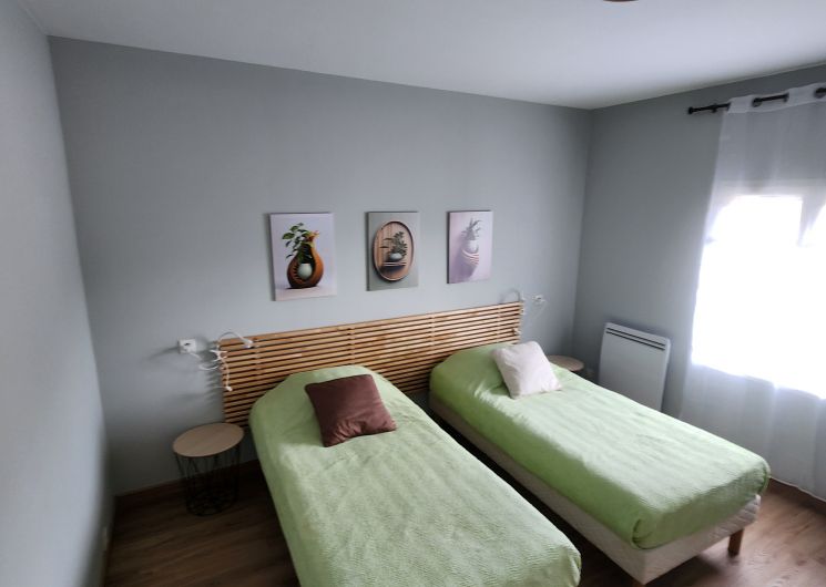 De deux chambres dont une avec un lit 160*200 et 2 meubles individuels aménagés pour le rangement des vêtements, la seconde comprend 2 lits individuels de 90*190 pouvant être rapprochés pour former un grand lit, deux tables de nuit, une tête de lit de 2.40m et deux armoires aménagées de 75*202 pour le rangement des vêtements