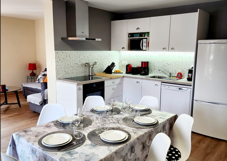 D’une cuisine ouverte totalement aménagée avec plaque de cuisson, hotte aspirante, four multifonctions, micro-onde, lave-vaisselle, réfrigérateur et congélateur. Très bien équipée en vaisselle, batterie de cuisine et petit électroménager.