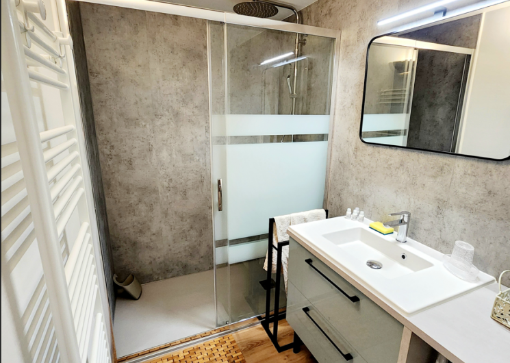 D’une salle de bains équipées d’une grande douche fermée avec paroi en verre, un plan de toilette avec vasque, meuble avec tiroir, sèche-cheveux, sèche serviette sur pieds et sèche serviette électrique, miroir avec applique