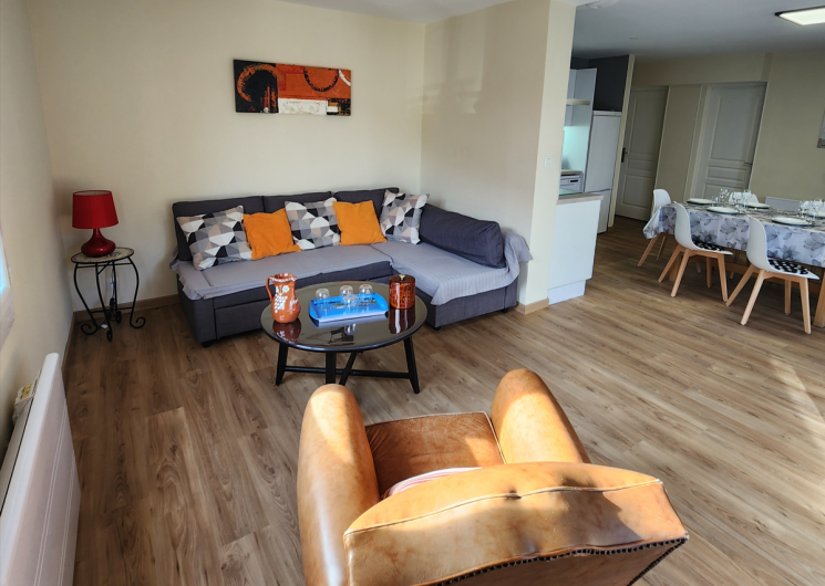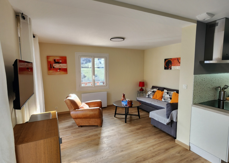 D’une grande pièce de vie avec salon comprenant un canapé convertible, un fauteuil, une table de salon, un meuble de salon et d’une télévision écran plat,
