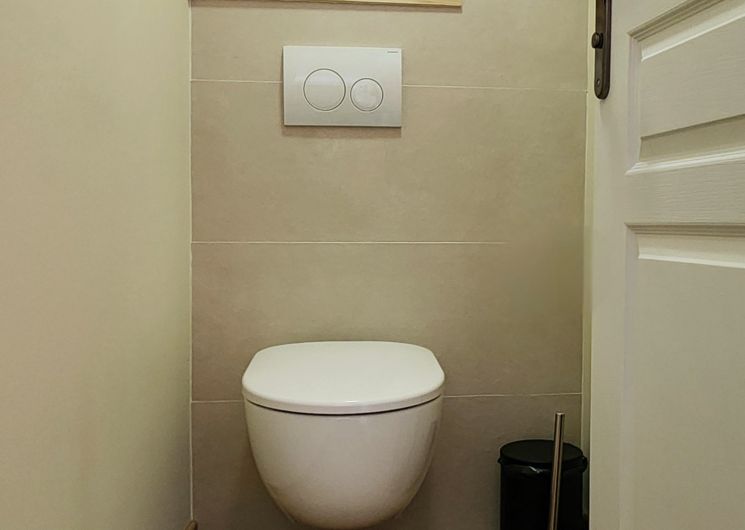 D’un WC séparé, WC suspendu avec aménagement mural, brosse et porte-papier sur pieds, poubelle.