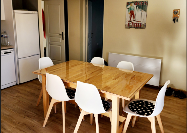 D’un espace repas avec table à manger et six chaises.
