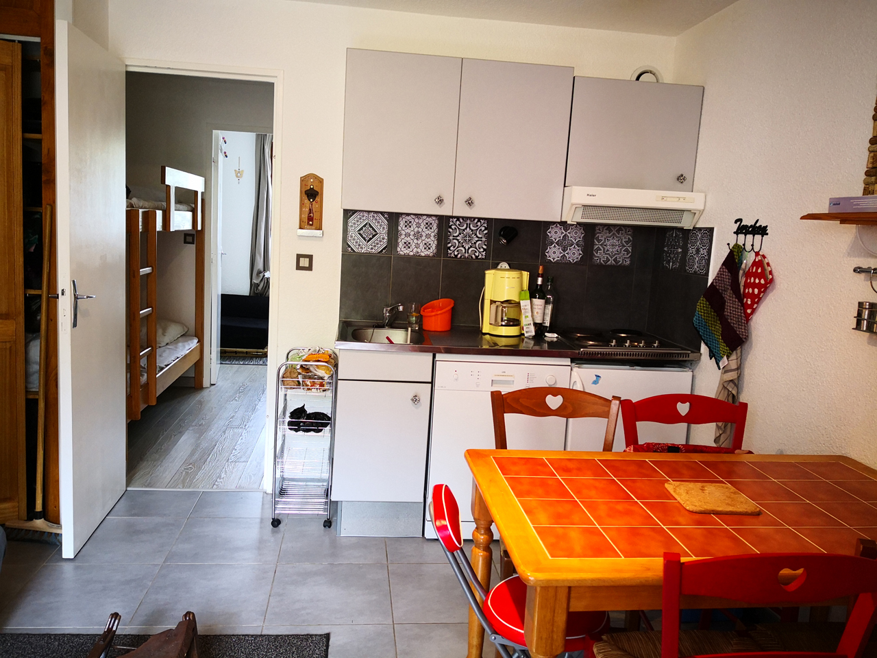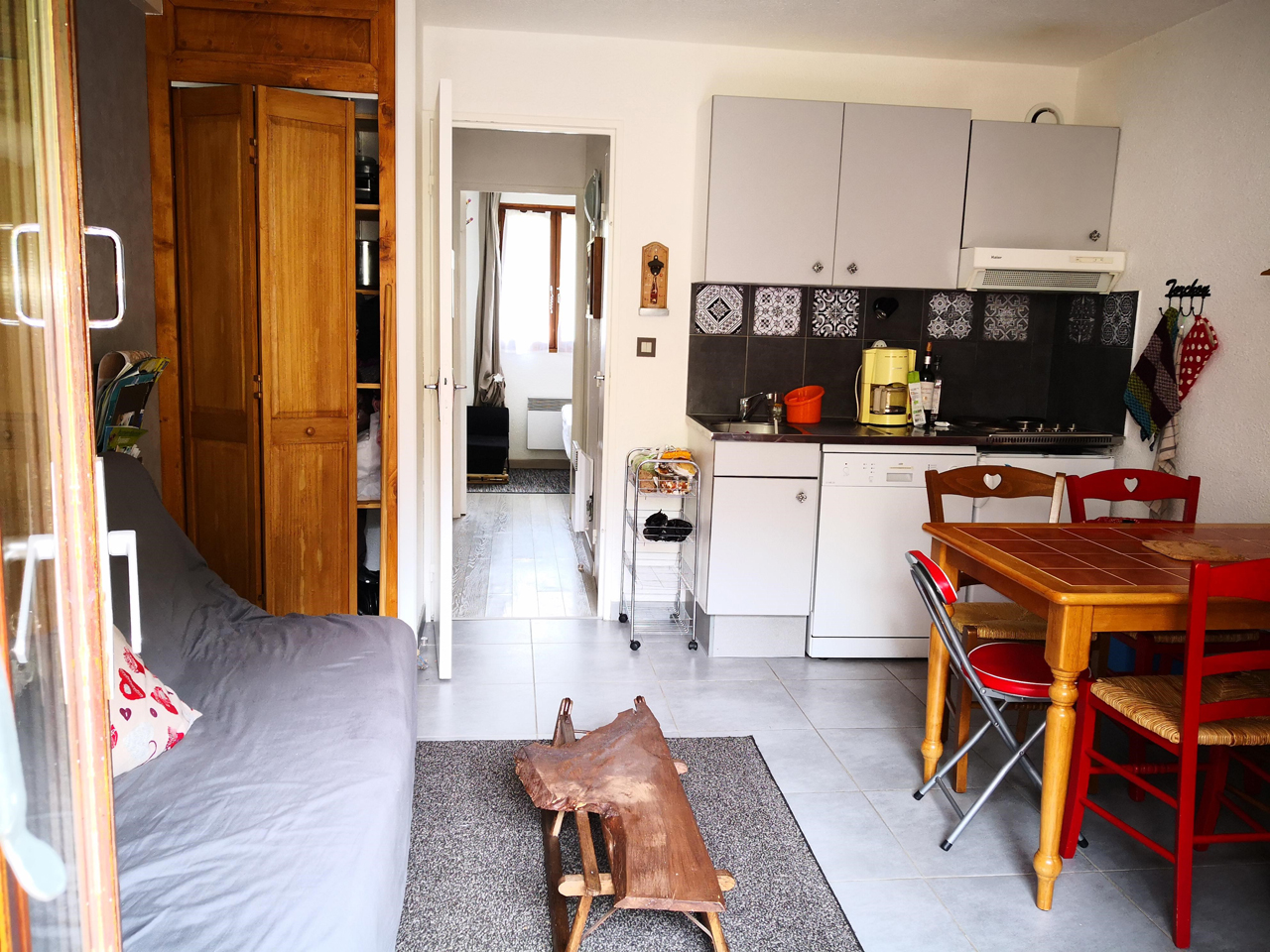 Appartement de 29 m² comprenant : Un coin salon / cuisine tout équipé avec un clic-clac, une chambre (lit en 140, lit parapluie ou une chauffeuse pour enfant), une alcôve équipée de lits superposés, une salle d’eau (douche), WC indépendant. La location bénéficie d’une terrasse privée avec salon de jardin et d’un casier a ski verrouillé.