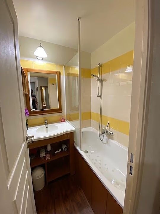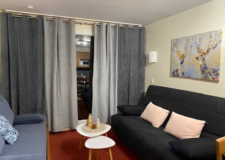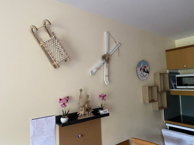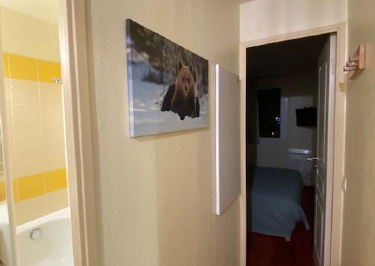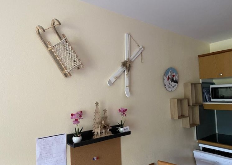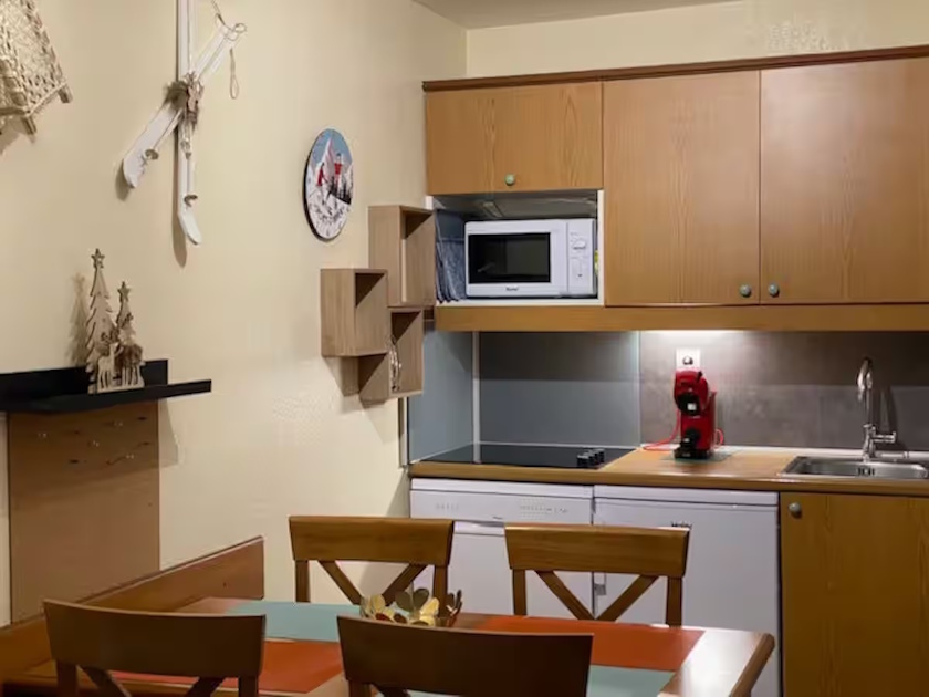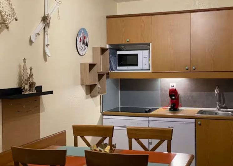 L’accès aux télécabines et au téléphérique est atteignable en quelques minutes. Le logement Vue sur la montagne, et jardins des thermes, la résidence est récente. 4 à 5 personnes peuvent y loger. L’appartement, très clair, dispose de : – un salon avec lit clic-clac 2 personnes et un lit simple, une télévision et DVD – un espace cuisine ouvert sur le salon, équipé d’un lave-vaisselle, micro-ondes, réfrigérateur, plaque vitrocéramique, placards, table et chaises. Vous y trouverez divers électro-ménagers, une bouilloire électrique, une cafetière Dolce Gusto et une cafetière simple à filtre, un grille-pain, un service à raclette. .