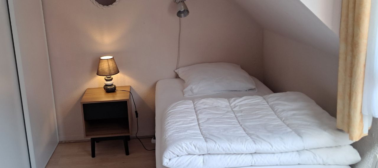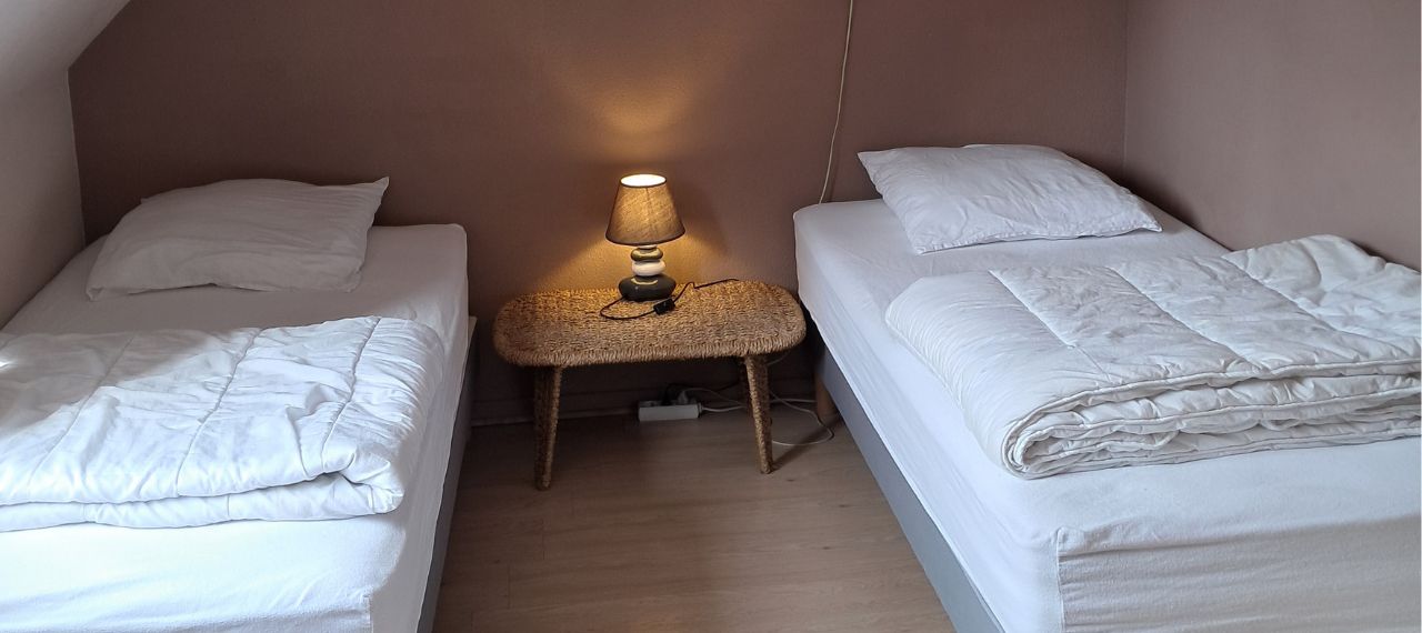 Salon avec bibliothèque. Chambre avec lit 140. Chambre avec 3 lits 90.