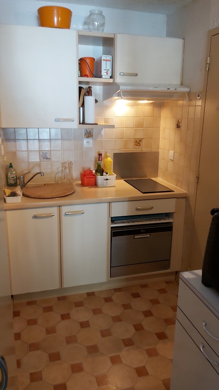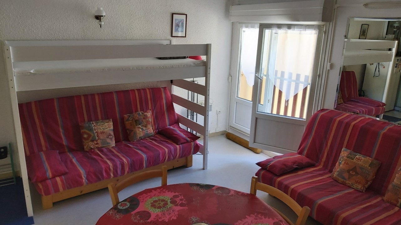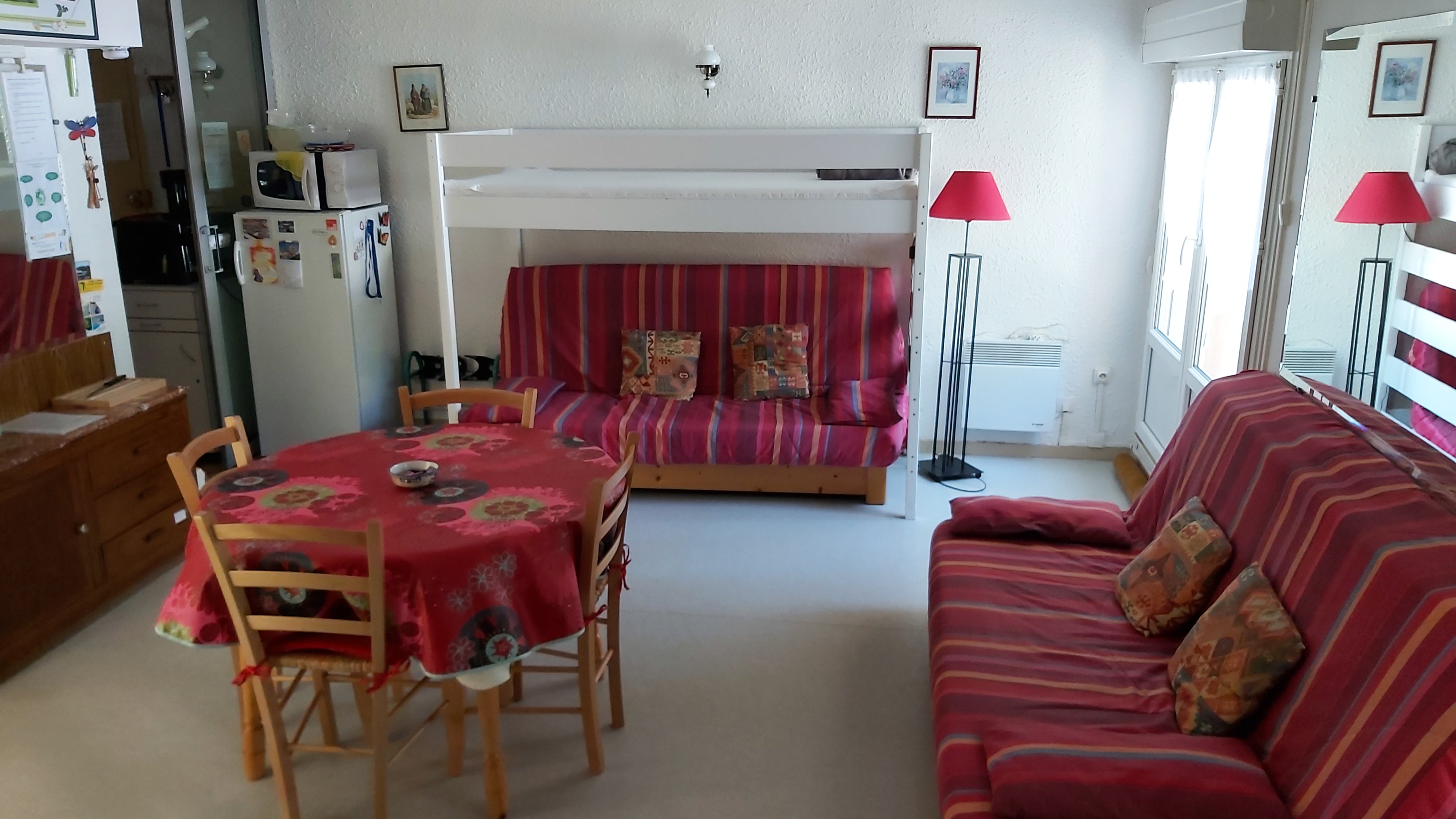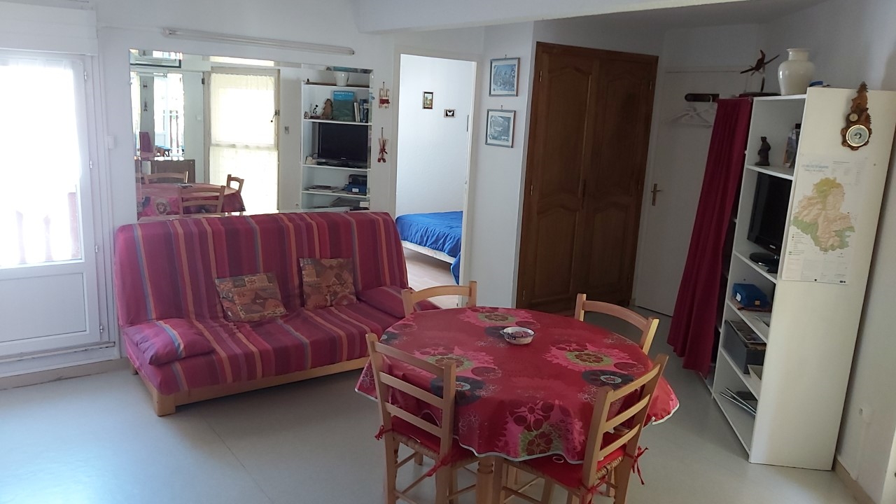 Appartement de 37 m² comprenant : Une kitchenette équipée, un séjour avec clic-clac (2 personnes) et 1 lit mezzanine au-dessus (pour enfant), une chambre séparée (1 lit en 140), une salle d’eau (douche) et WC indépendant. La location bénéficie d’un local à ski avec également des crochets pour ranger des vélos et d’un parking public devant la résidence.