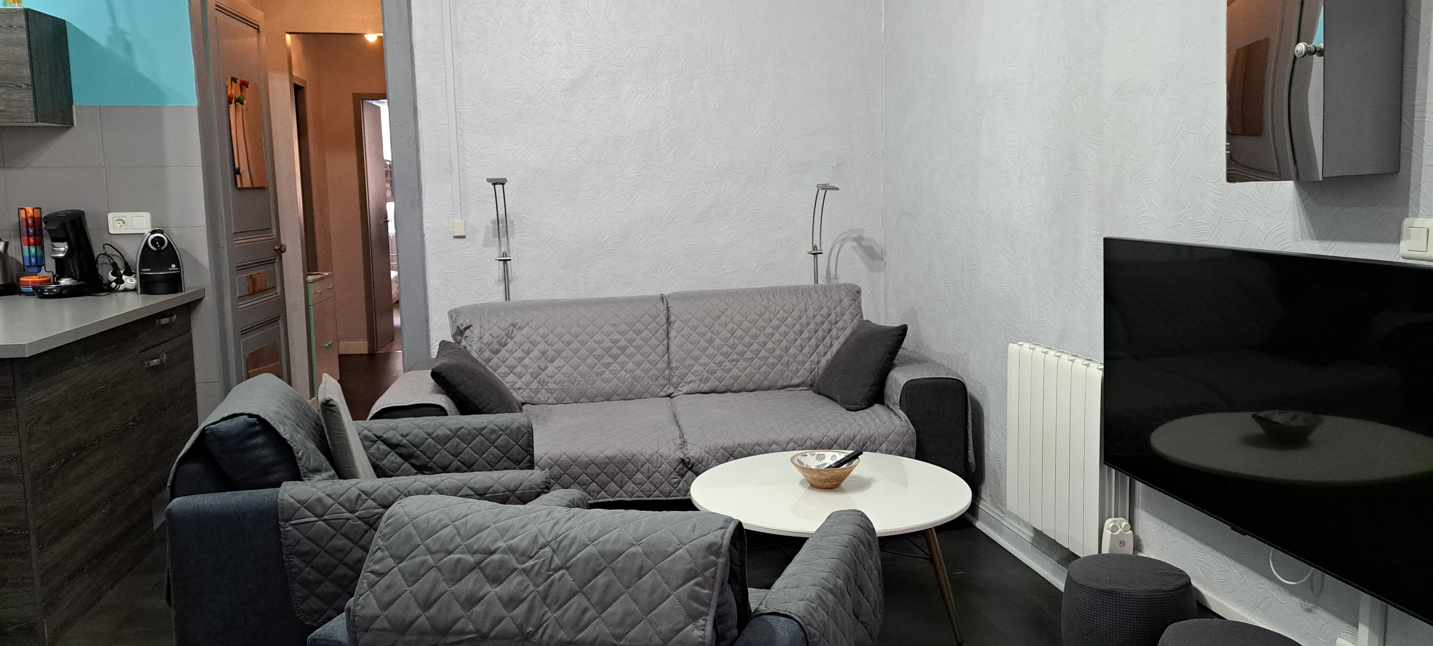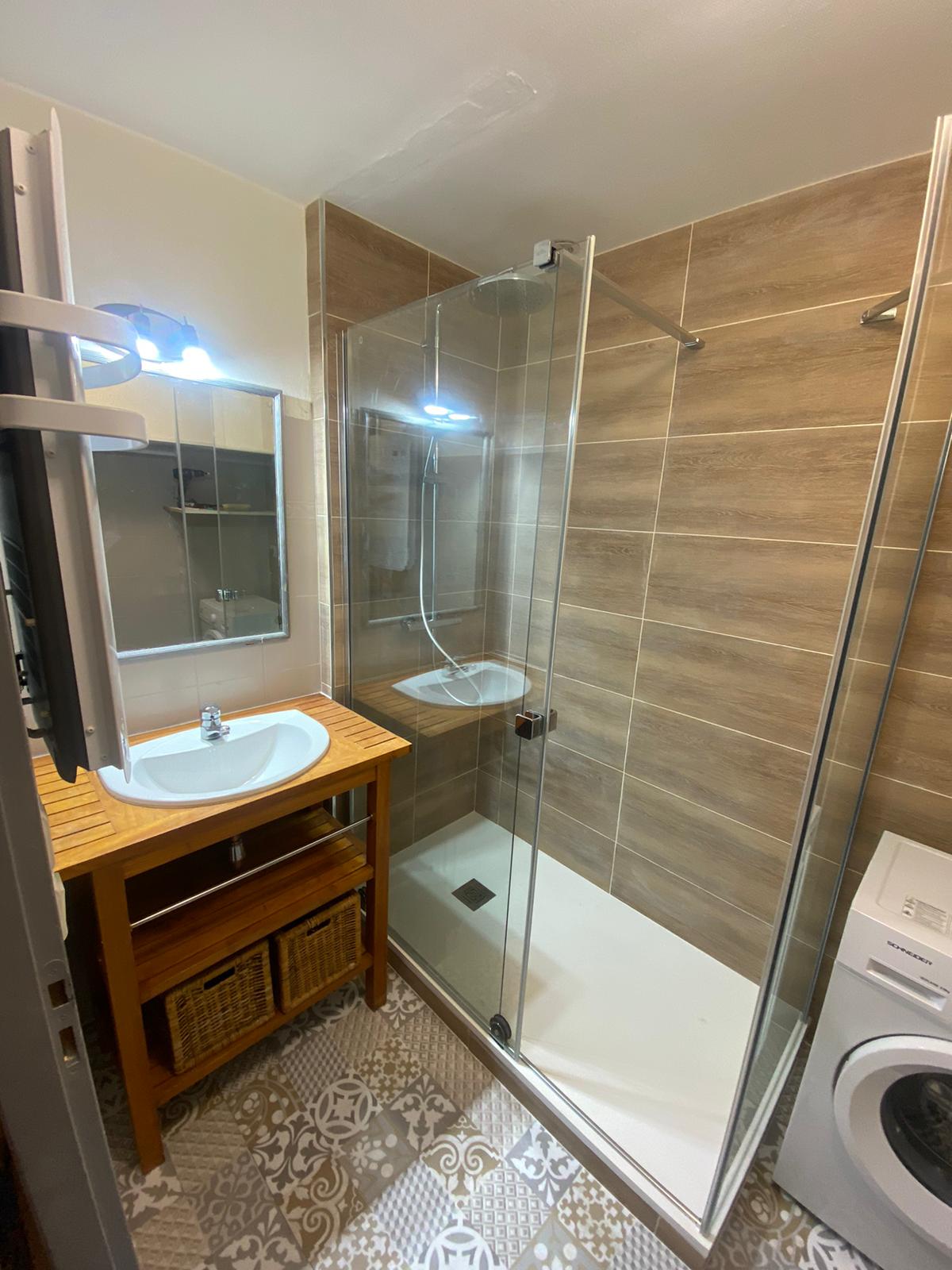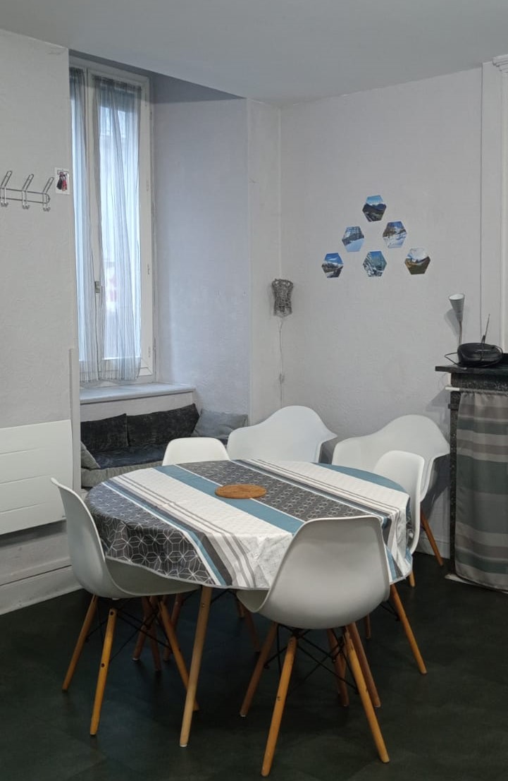 Appartement de 50 m2 en rez-de-chaussée (résidence accessible par 3 petites marches) comprenant : Une grande pièce de vie avec cuisine équipée ouverte sur un salon avec un canapé-lit (en 140) et 2 fauteuils, Une chambre avec vue sur le torrent (1 lit en 140 et 2 lits en 90 superposés), Une salle d’eau avec une douche à l’italienne. WC indépendant.