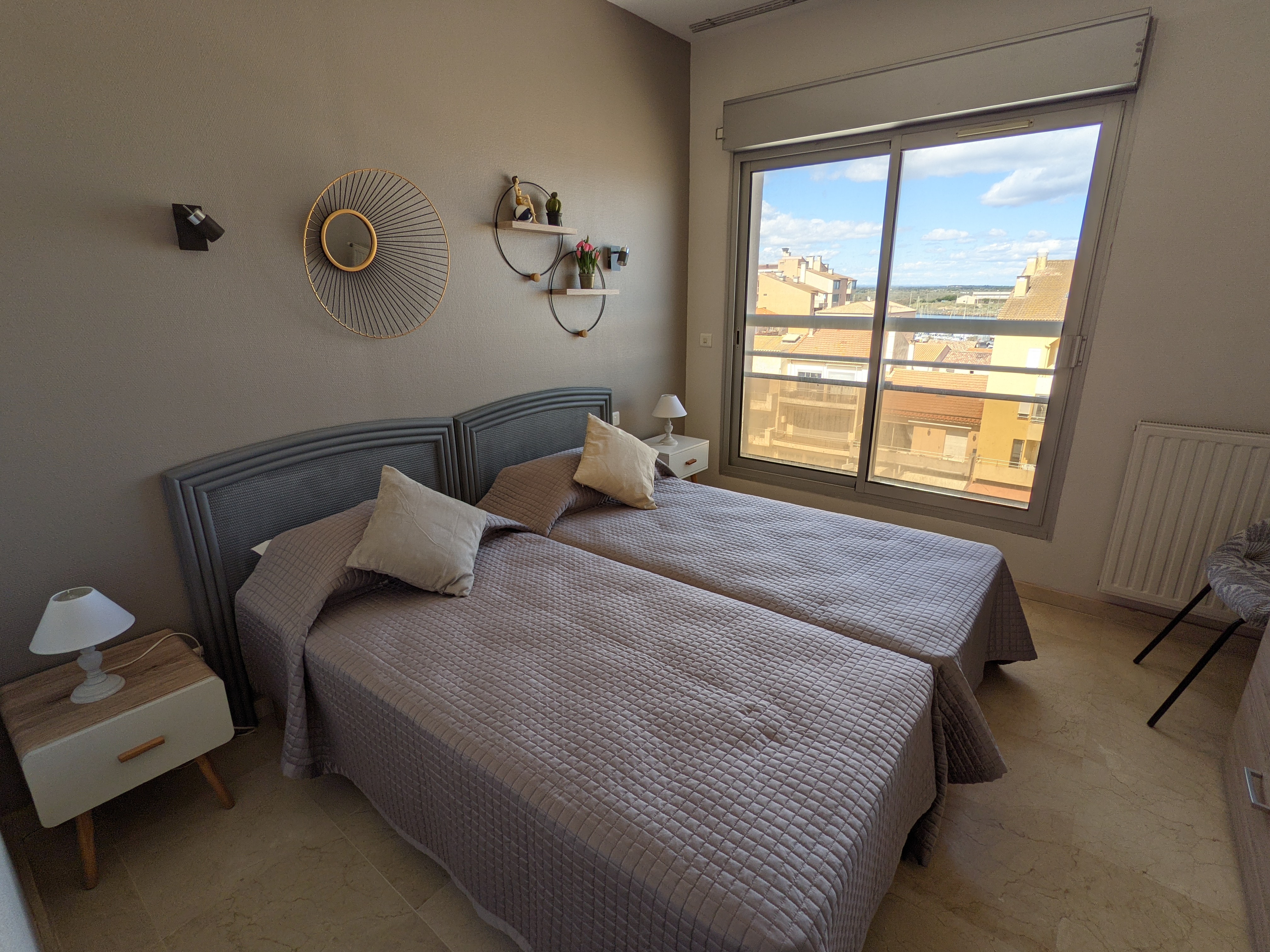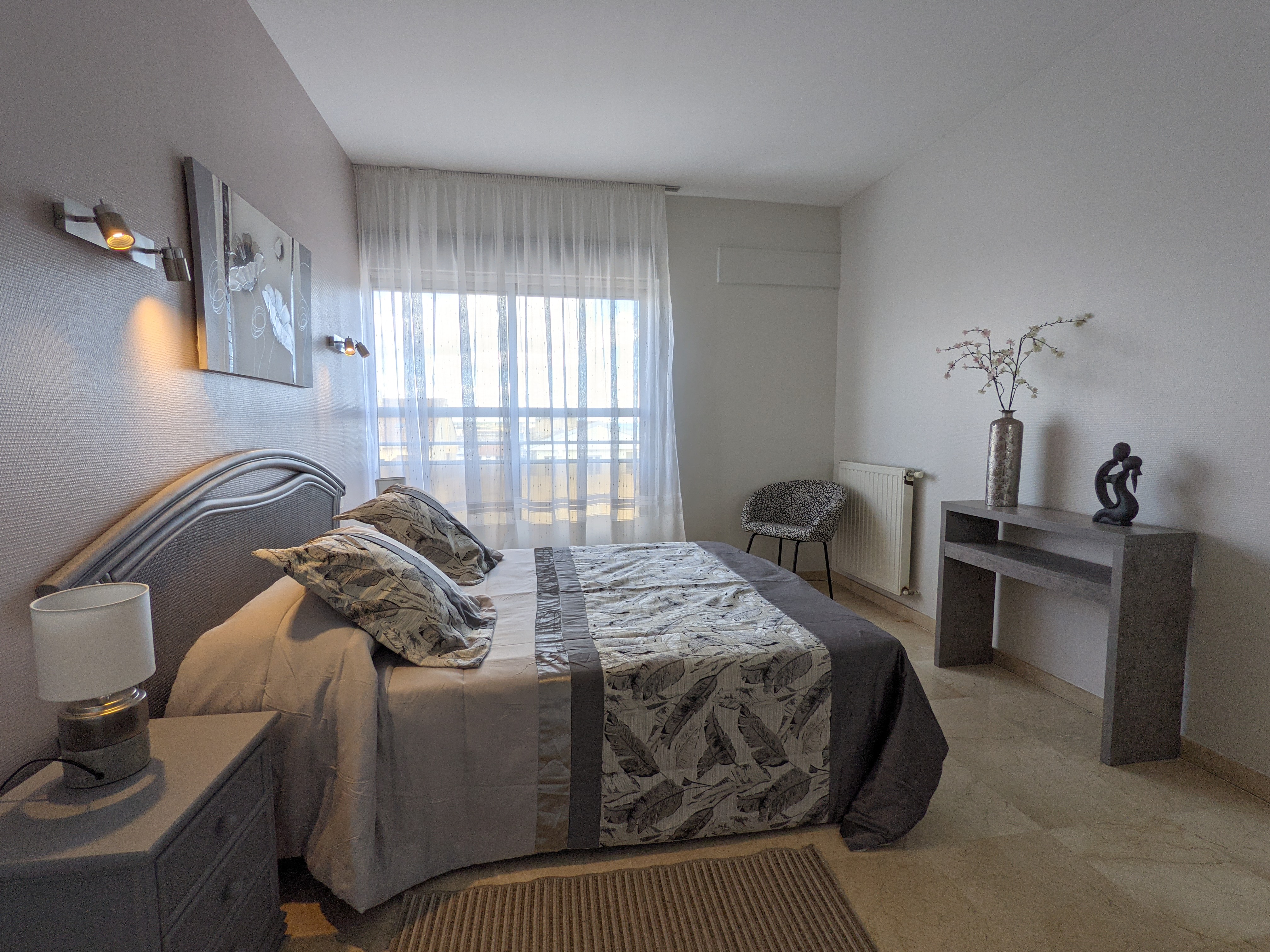 Appartement T4 dans immeuble, capacité d’accueil 6 personnes, vue sur la mer, 4ème étage, ascenseur, superficie 125 m², chambre 1 : 1 lit 160, chambre 2 : 2 lits 90, chambre 3 : 2 lits 90, séjour-salon avec cuisine américaine, lave-vaisselle, lave-linge, congélateur, micro-ondes, four, télévision couleur, téléphone, Salle de bain et salle d’eau, chauffage, climatisation, terrasse. Animaux admis.